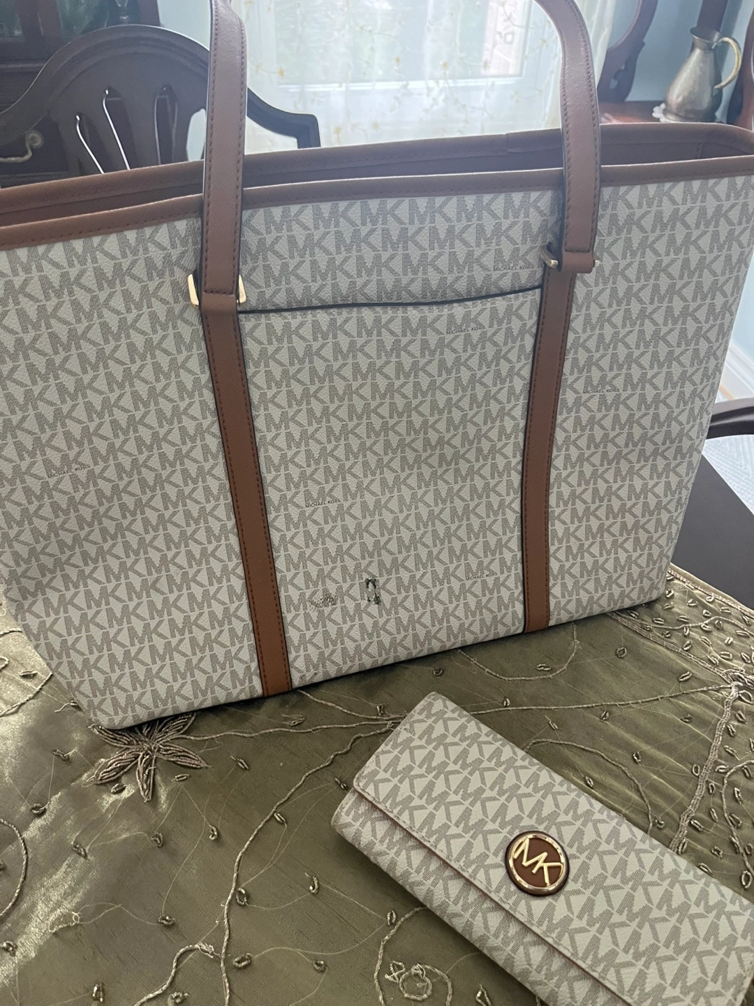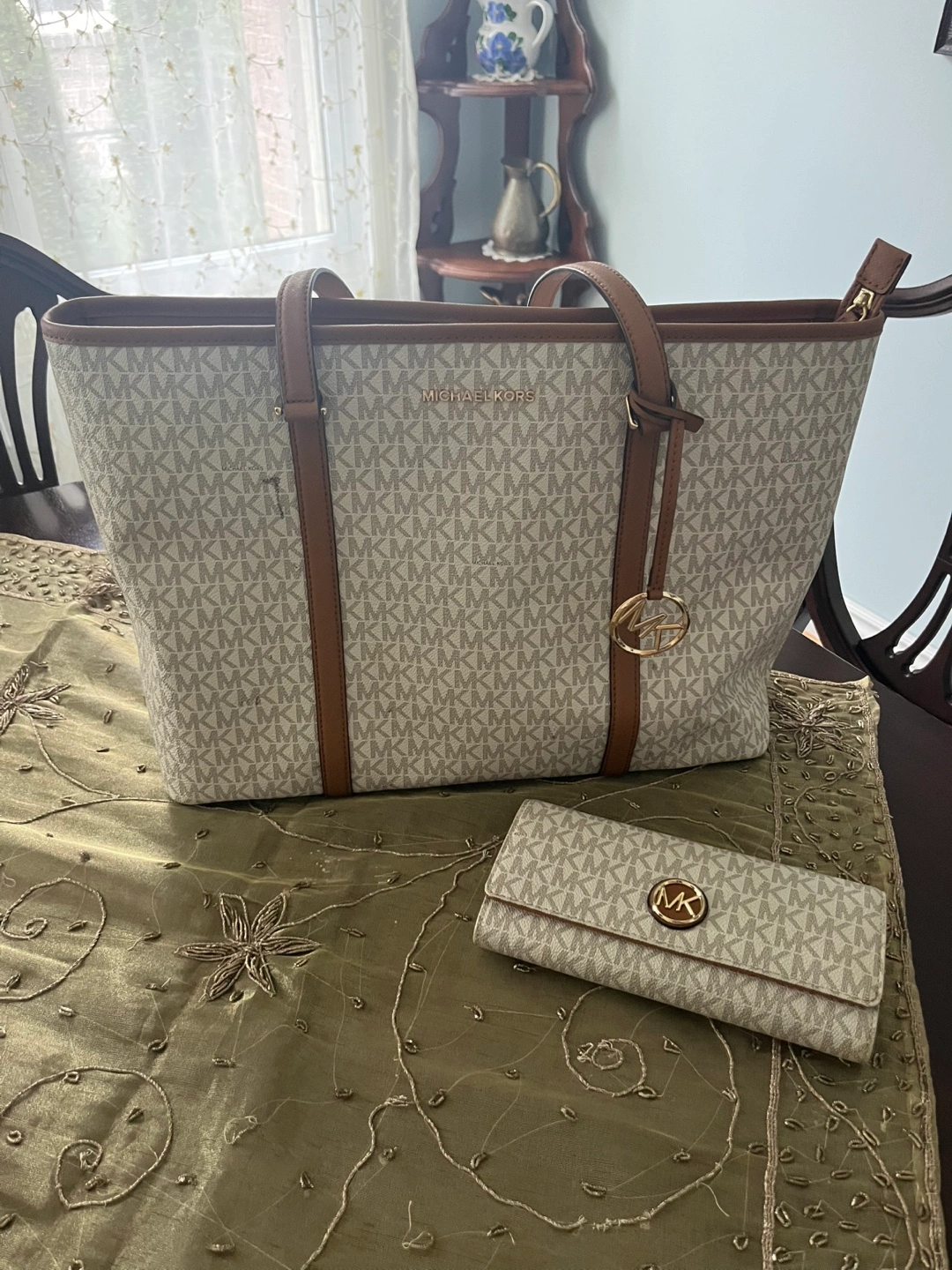 2 pieces! Selling a stylish Michael Kors tote bag and matching wallet! Both are in good condition and feature the classic MK logo pattern. The bag has minor scratch. The bag alone retails for $298! Perfect for everyday use! Can sell separately.