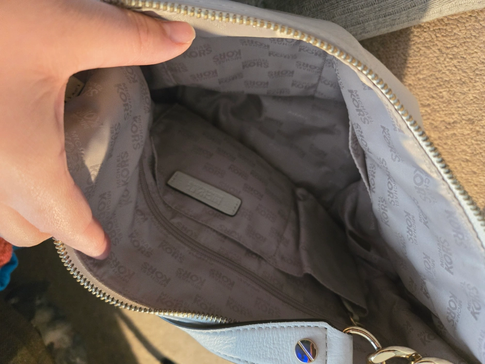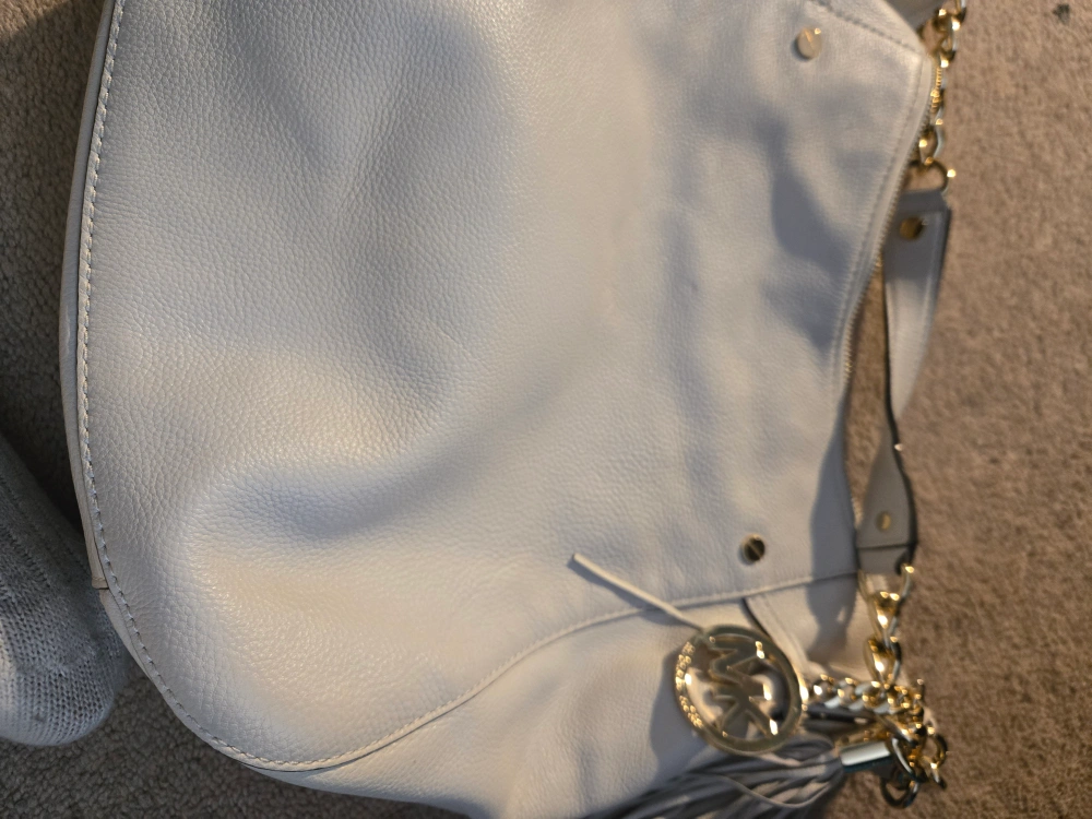 Here's a stylish Michael Kors shoulder bag in a lovely white leather! It's perfect for carrying your everyday essentials. The bag features a chain detail and the iconic MK logo. It's in great condition and ready for a new home!