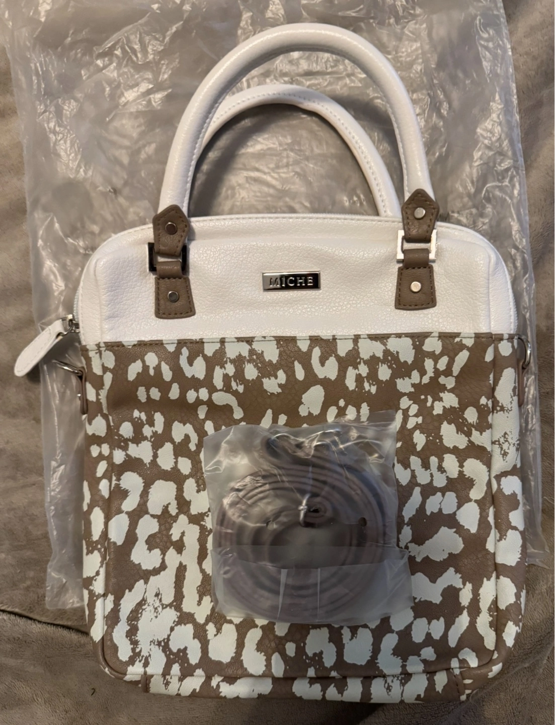 109Stylish satchel. Two-toned design. White top, taupe bottom with leopard print. Removable strap included. Great for everyday use.