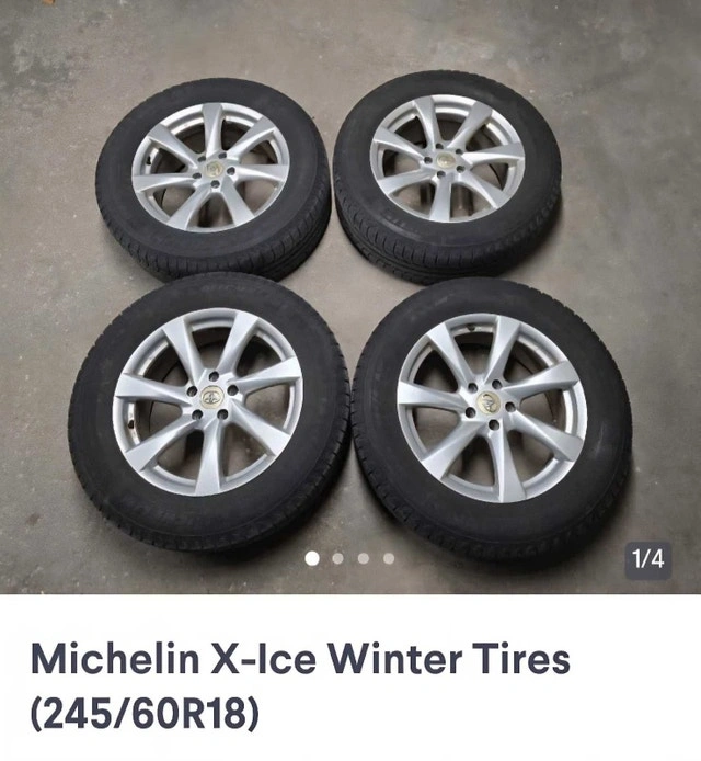 0Selling a set of 4 used tires and rims off of a Toyota Venza Michelin X-Ice Winter Tires 75%-80 % left Toyota after market 18x7.5 rims With lug nuts. Bolt Pattern 5 x114.4 60.1 center bore