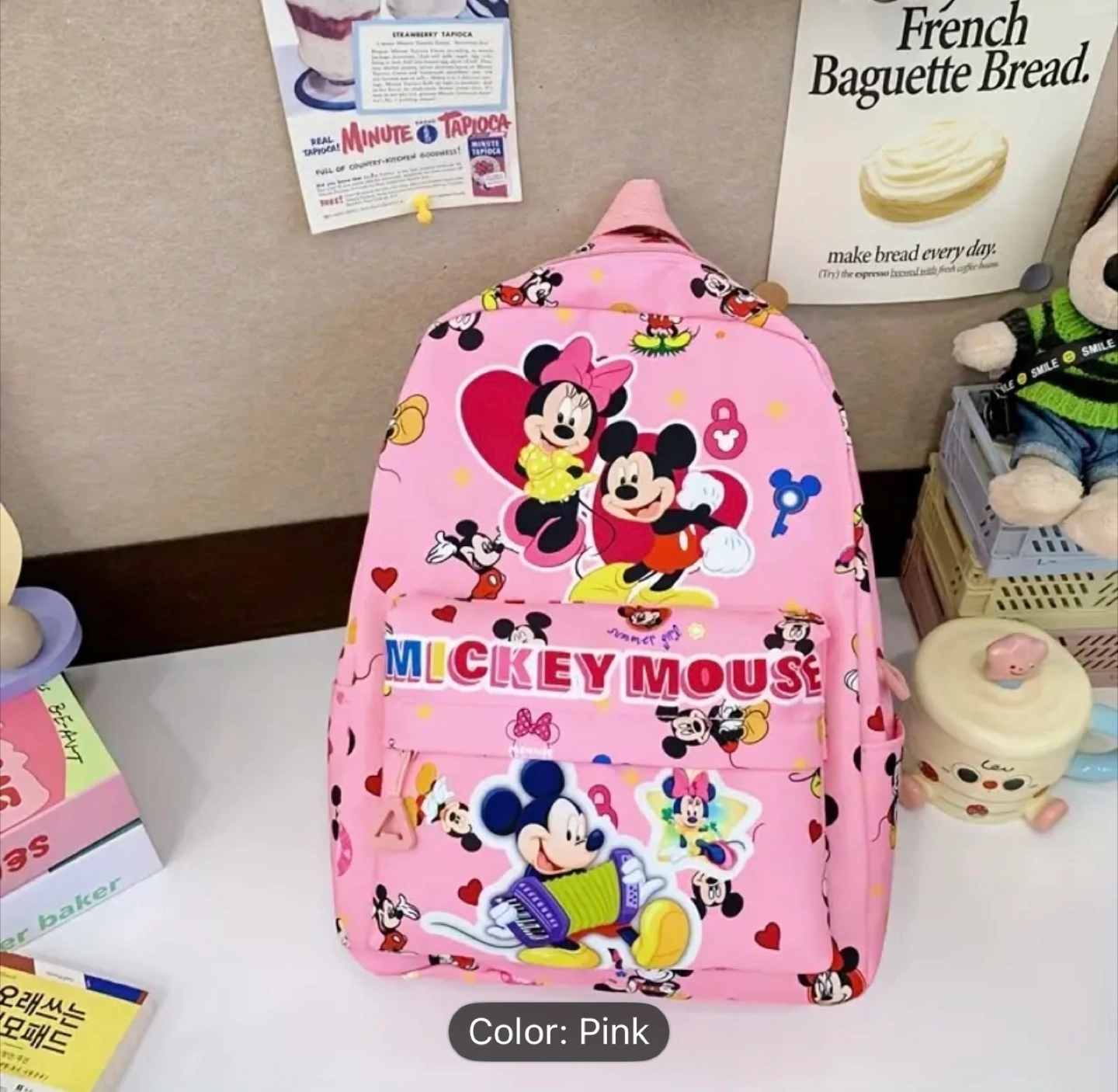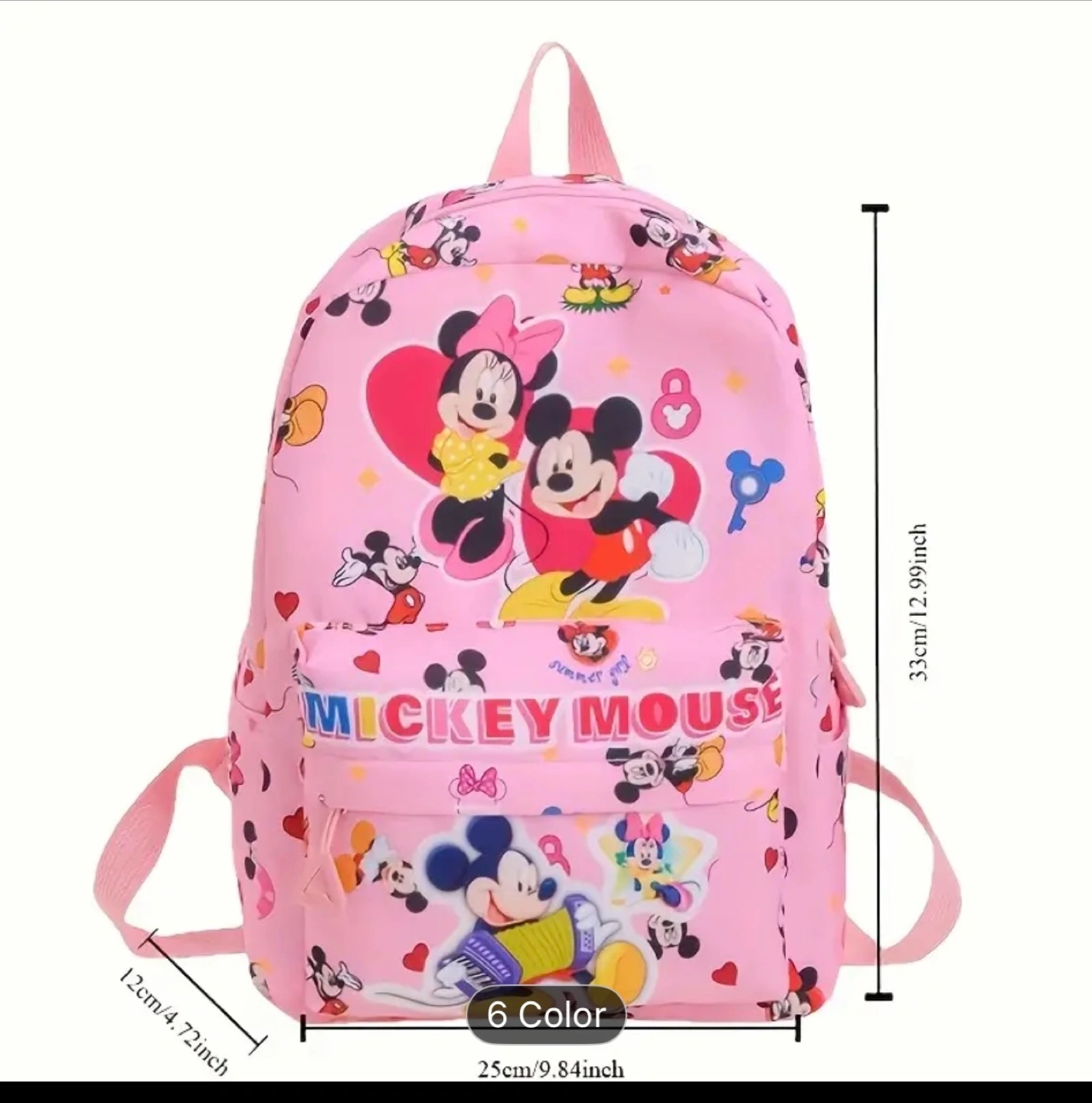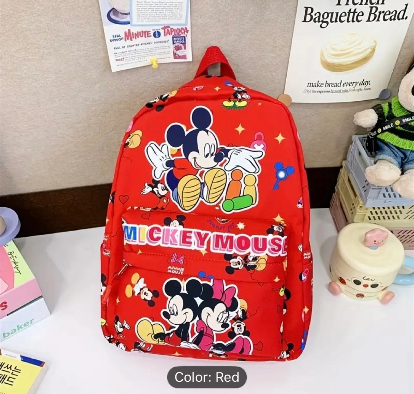 Super cute Mickey Mouse backpack! It's red and features Mickey and Minnie Mouse designs. Perfect for your little one to carry their favourite things. The size is about 33cm/12.99inch in height, 25cm/9.84inch in width, and 12cm/4.72inch in depth