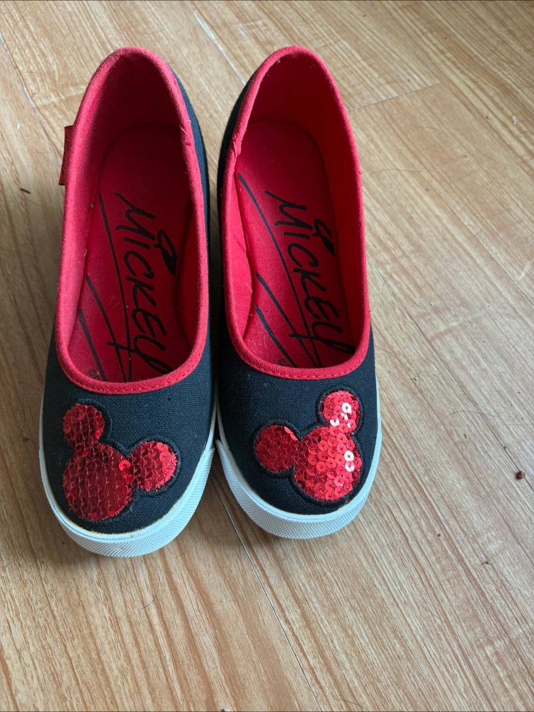 Cute Mickey Mouse shoes in black and red! Size 6 They feature a fun sequin design on the toe and are in good condition. Great for everyday wear!