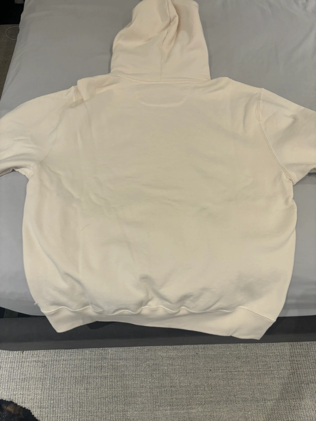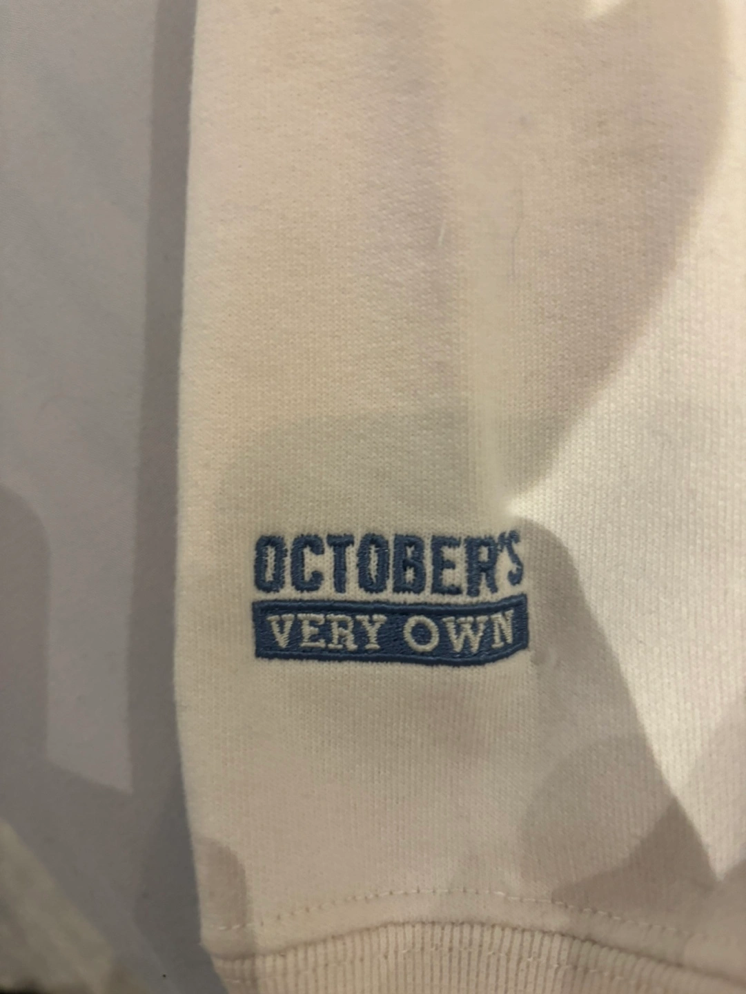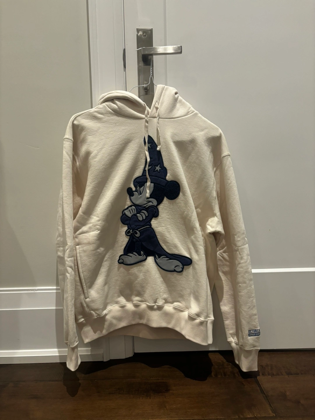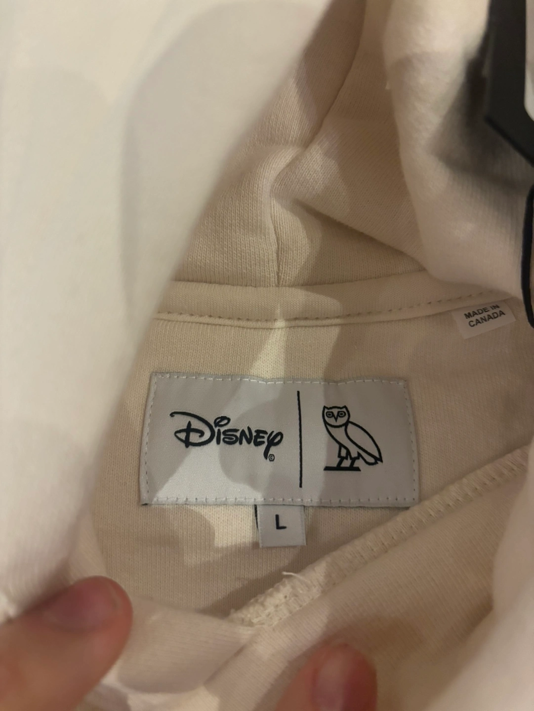 Cream-coloured hoodie, features large embroidered Mickey Mouse graphic. Size large. Made in Canada. October's Very Own branding. Collaboration with Disney.