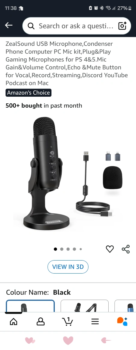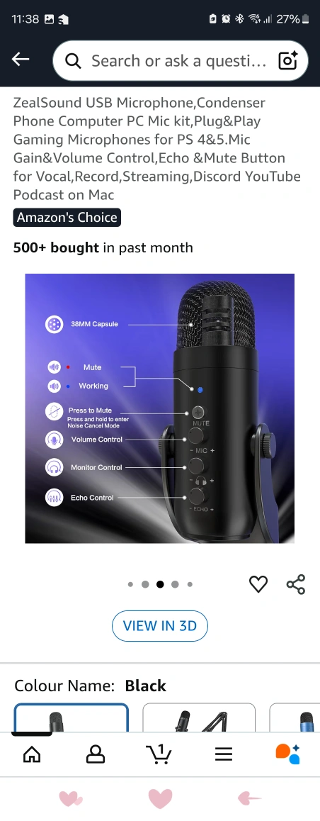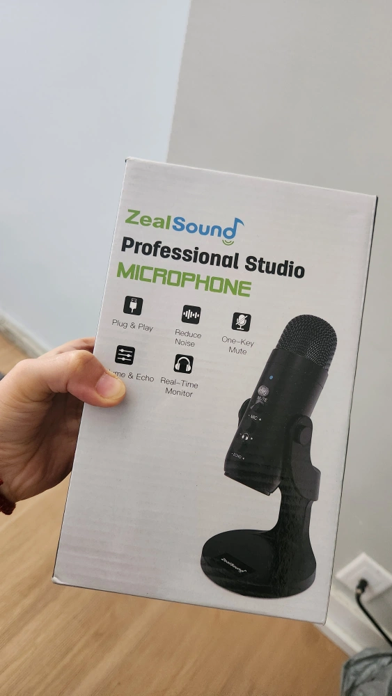10Selling a ZealSound USB Microphone in black. Perfect for vocal recording, streaming, or podcasting. It features a 38mm capsule, mute button, volume control, and echo control. The microphone is designed for use with PC, PS4/5, and Mac. Includes a USB cable and microphone cover