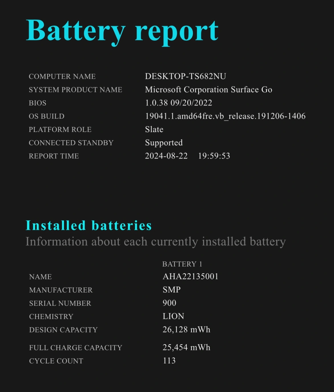 103Great condition however battery has degraded over time. 113 cycles. Comes with Type Cover, Surface Pen, charger, 7 AAAA batteries for surface pen and battery holder.