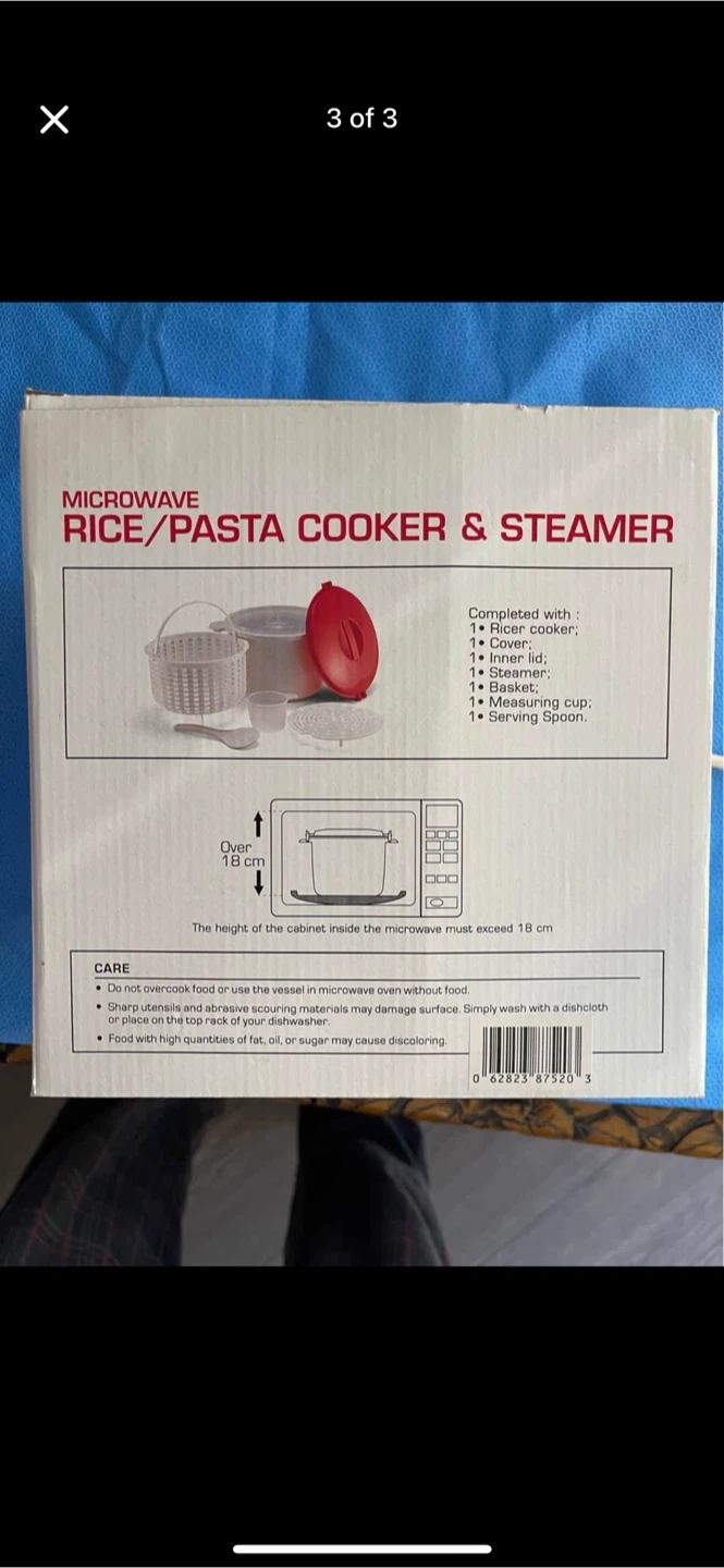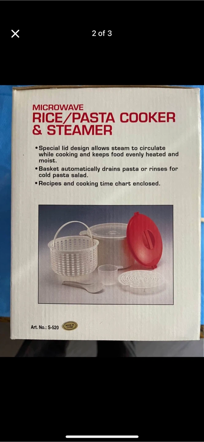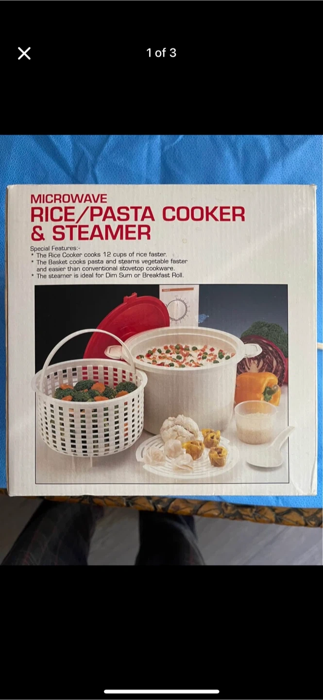 Selling a brand new microwave rice and pasta cooker and steamer, still in its original box! This handy cooker makes rice and pasta 12 times faster and is easier than stovetop cookware. It features a special lid design to circulate steam, keeping food evenly heated and moist. It comes complete with: - Rice cooker - Cover - Inner lid - Steamer - Basket - Measuring cup - Serving spoon