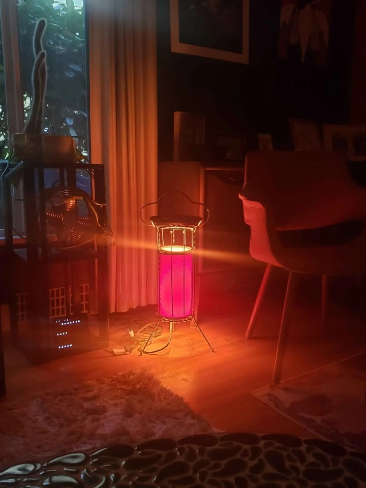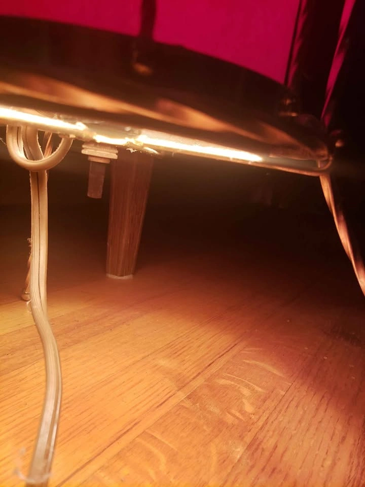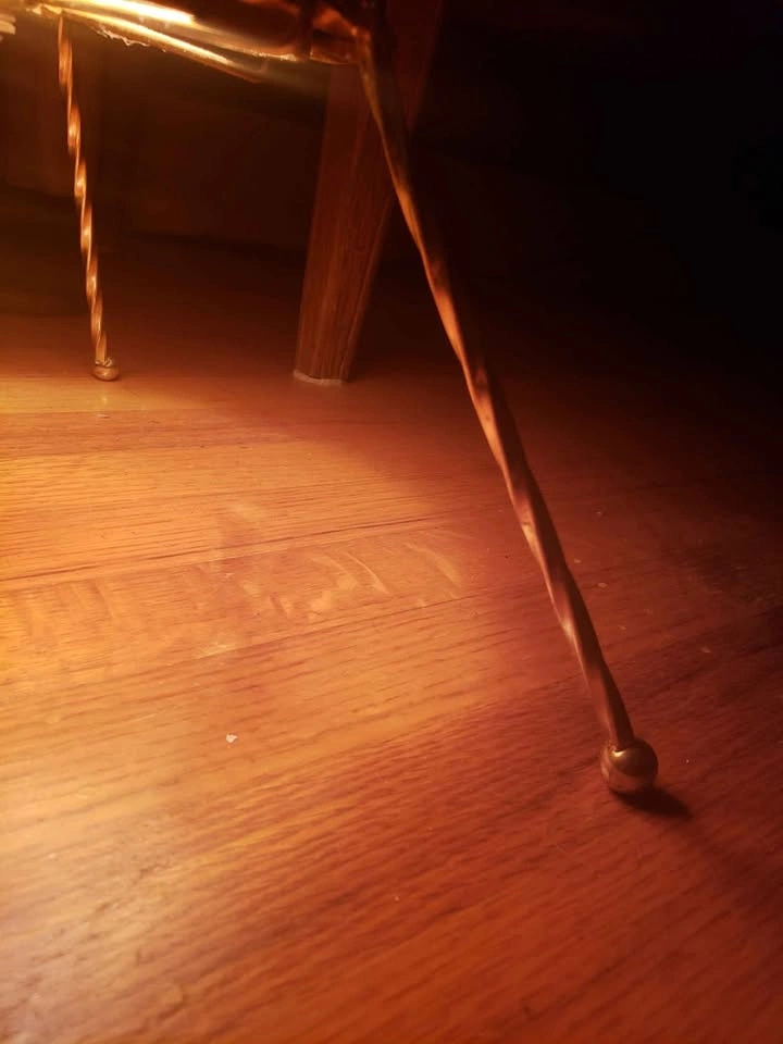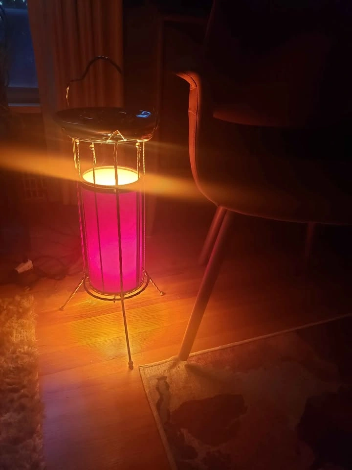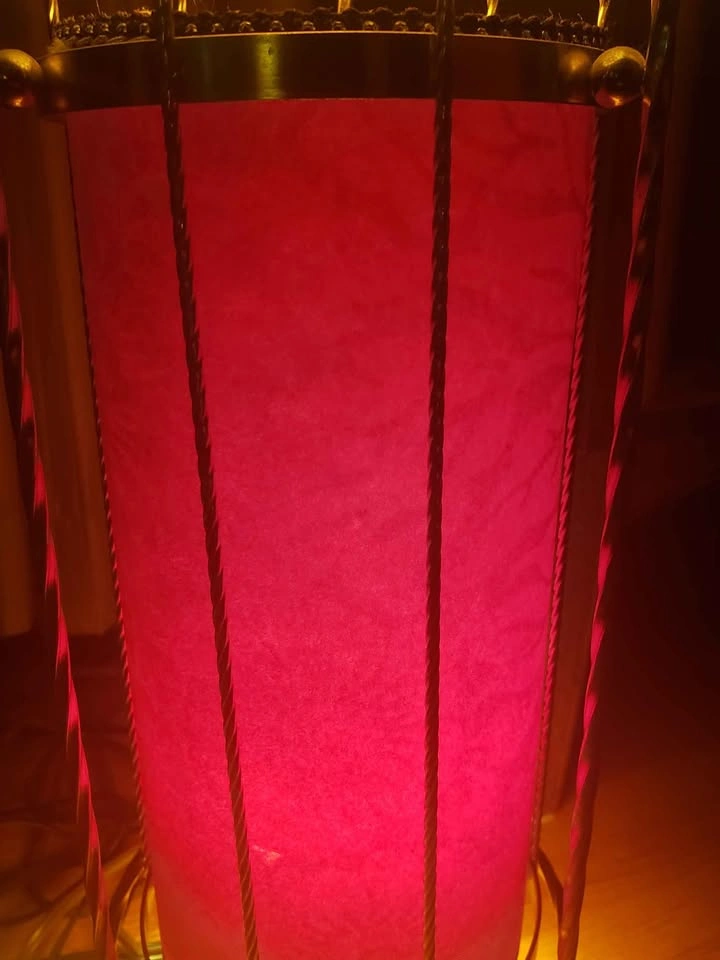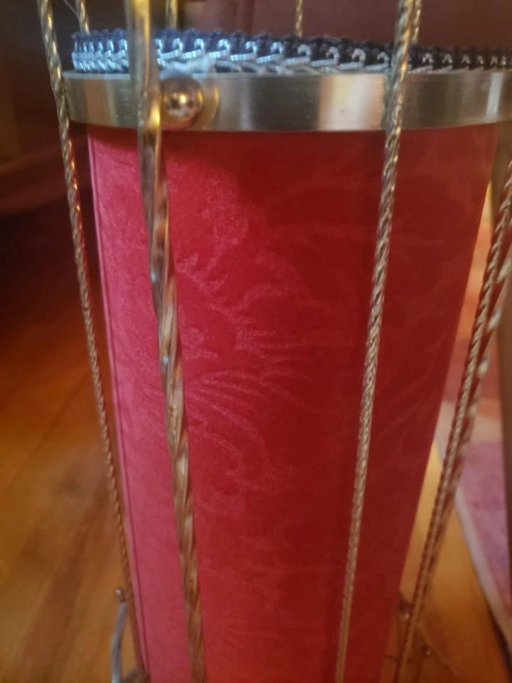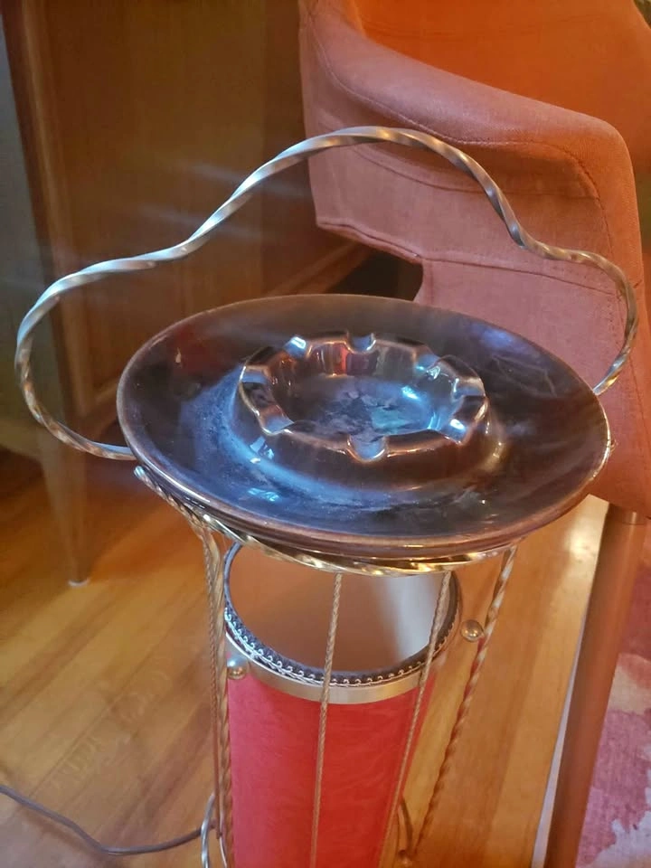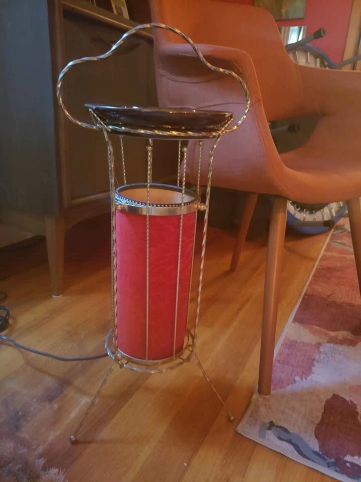 251960s standing ash tray lamp. Works well. Twisted brass stand 28 inches tall with red velvet lampshade fitted inside the brass base. Stands on three brass legs with spherical feet. Brown glass ash tray included. Light switch is on the bottom. There is a flower pattern embossed into the velvet shade. Gives a lovely warm glow at night. Very cool retro piece. Cross posted with Marketplace. Pick up in Upper Lonsdale North Vancouver.
