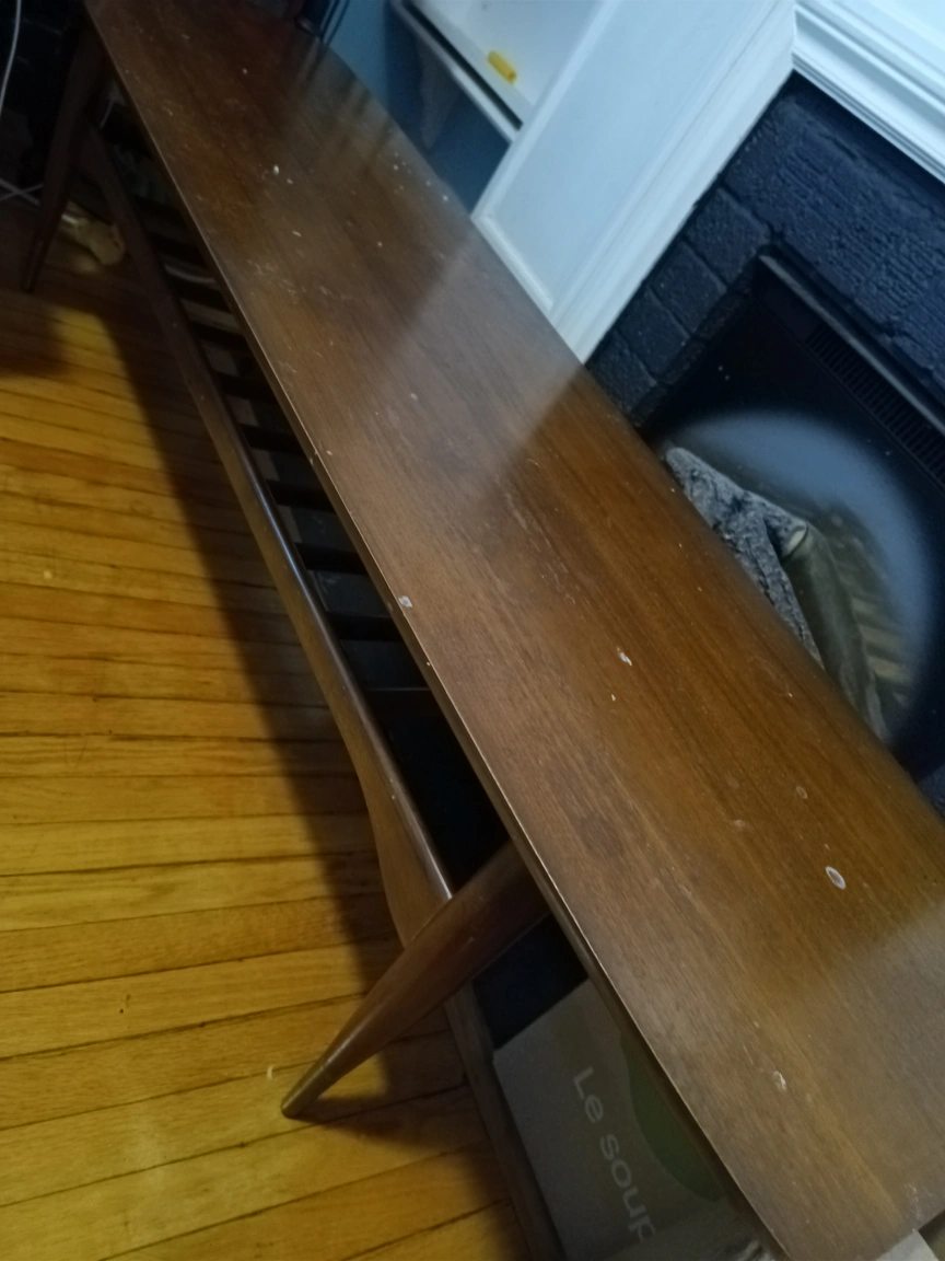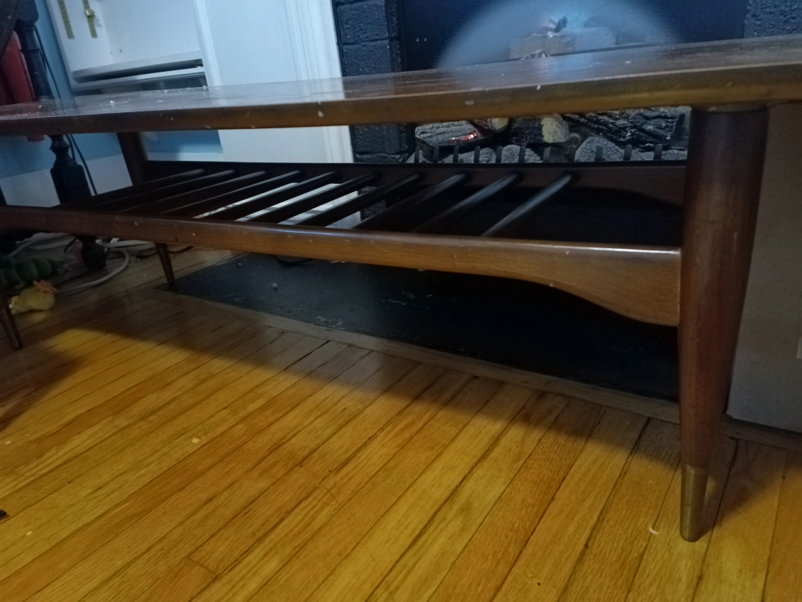 241Vintage coffee table, dark wood finish. Lower shelf for storage. Minor wear consistent with age and use. Tapered legs with brass-coloured tips. Great addition to a retro or mid-century modern home.