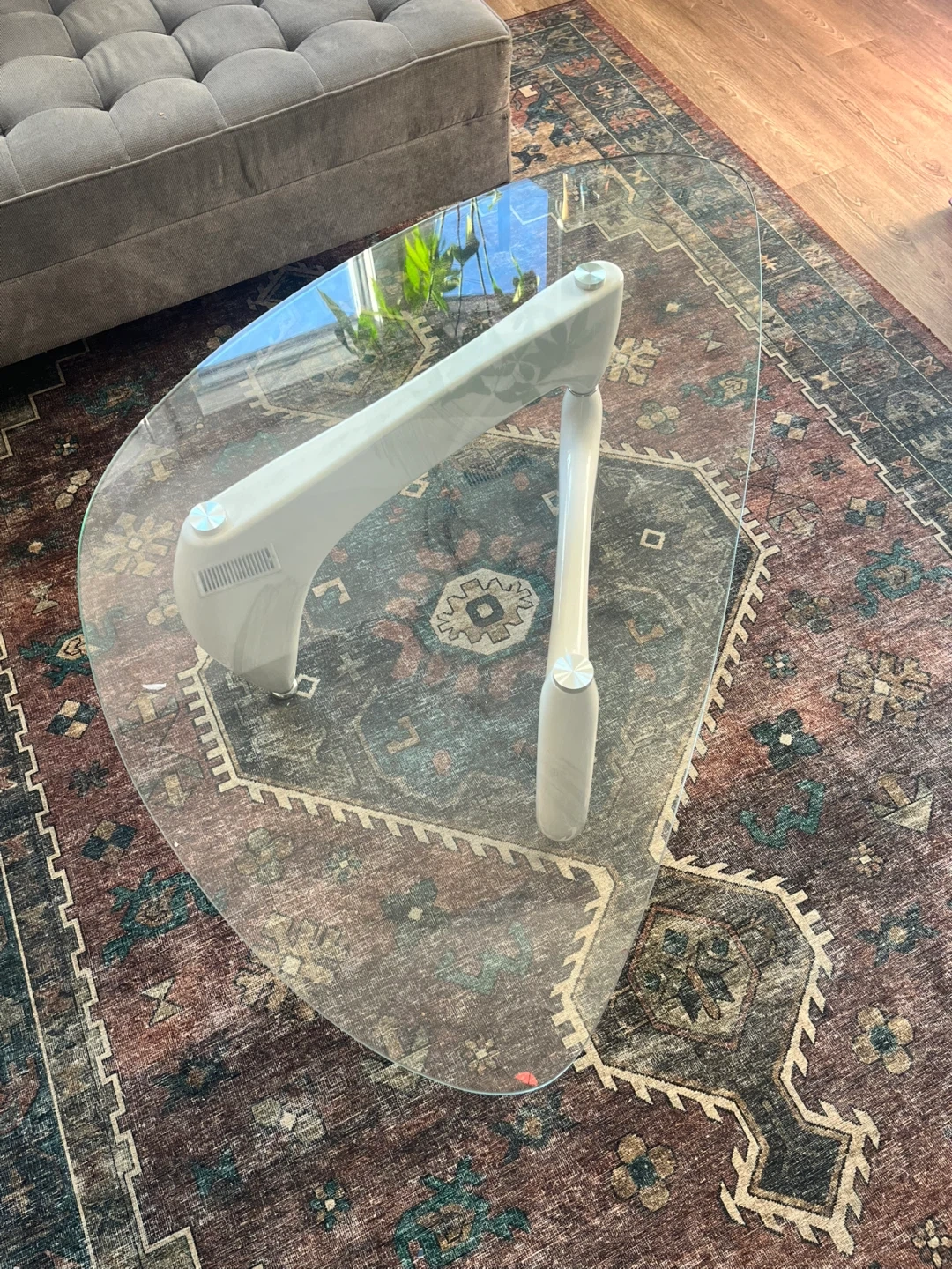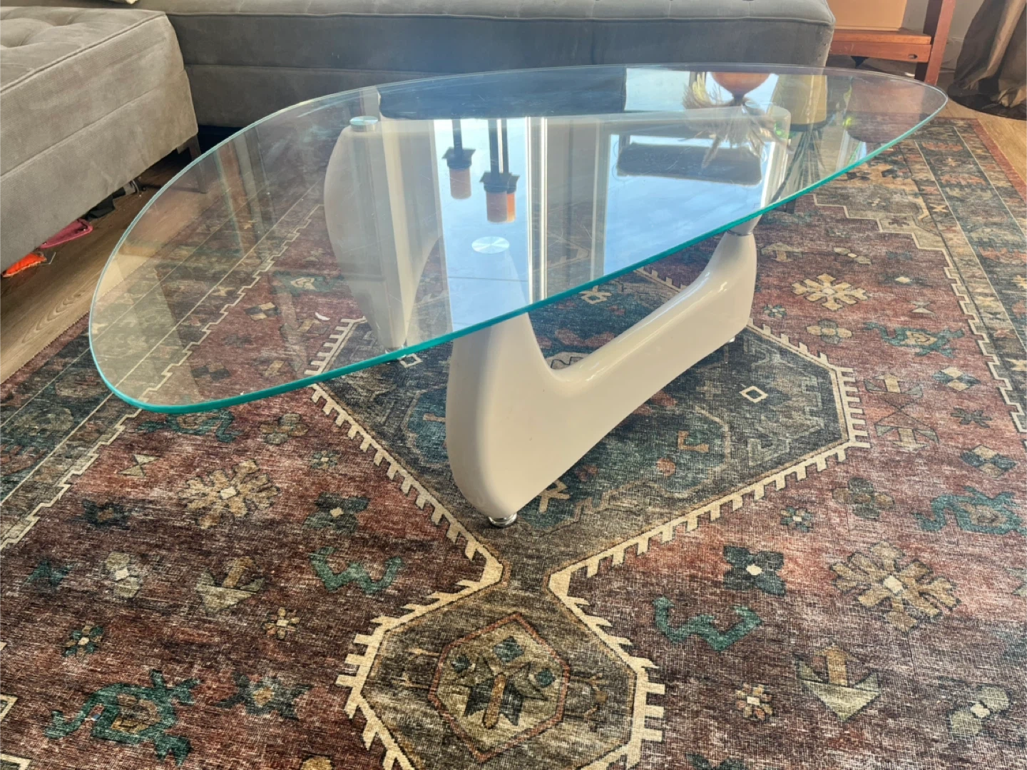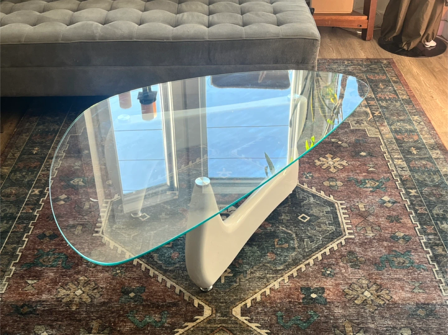 Noguchi inspired glass coffee table with chic mid-century design. Perfect for condo/ apartment living spaces. Like new, no damage. Dimensions: - 47 inches lengthwise - 27 inches max width - 16 inches tall