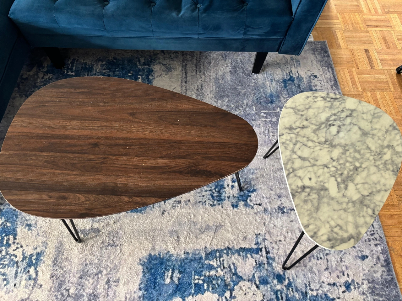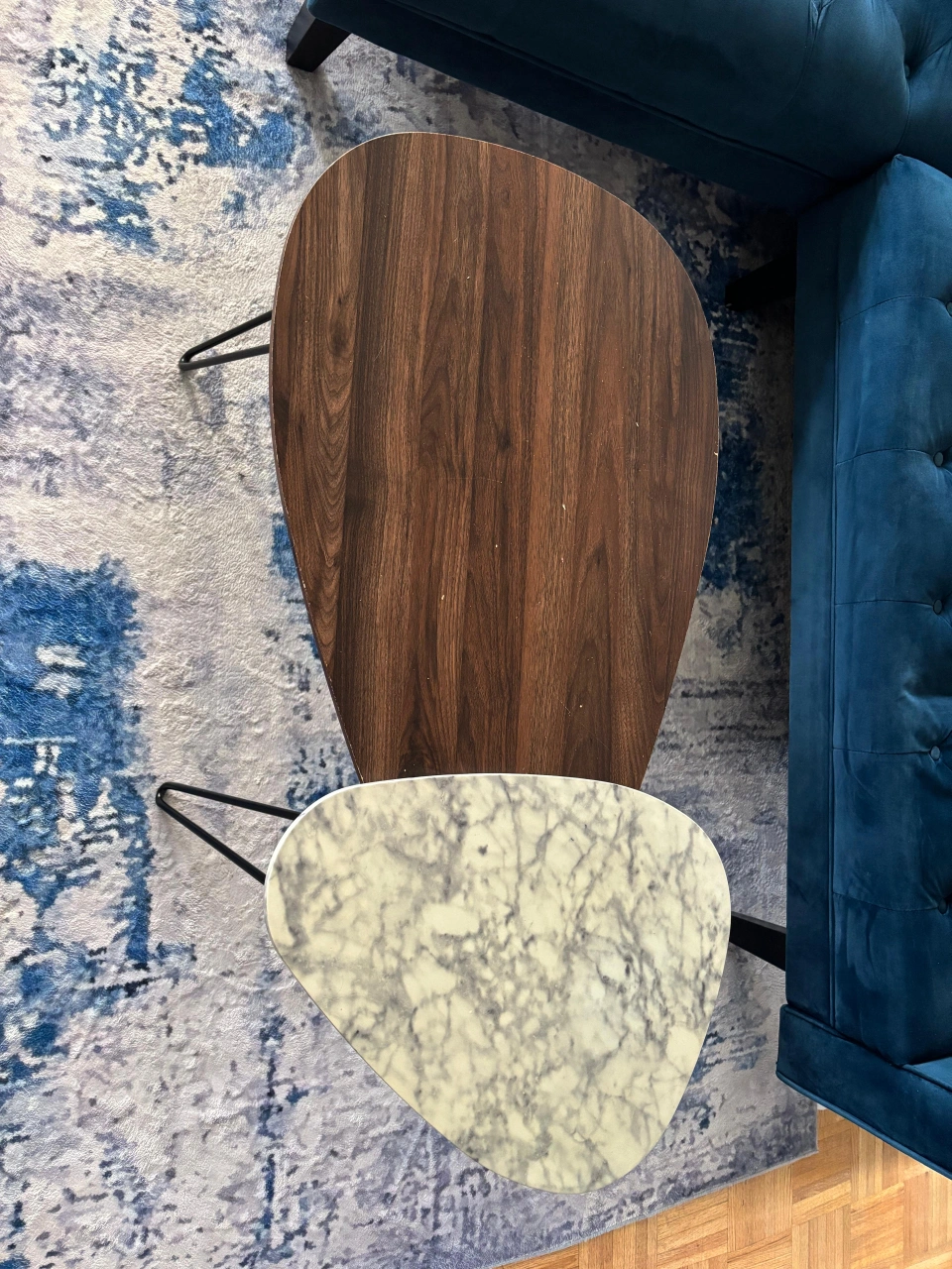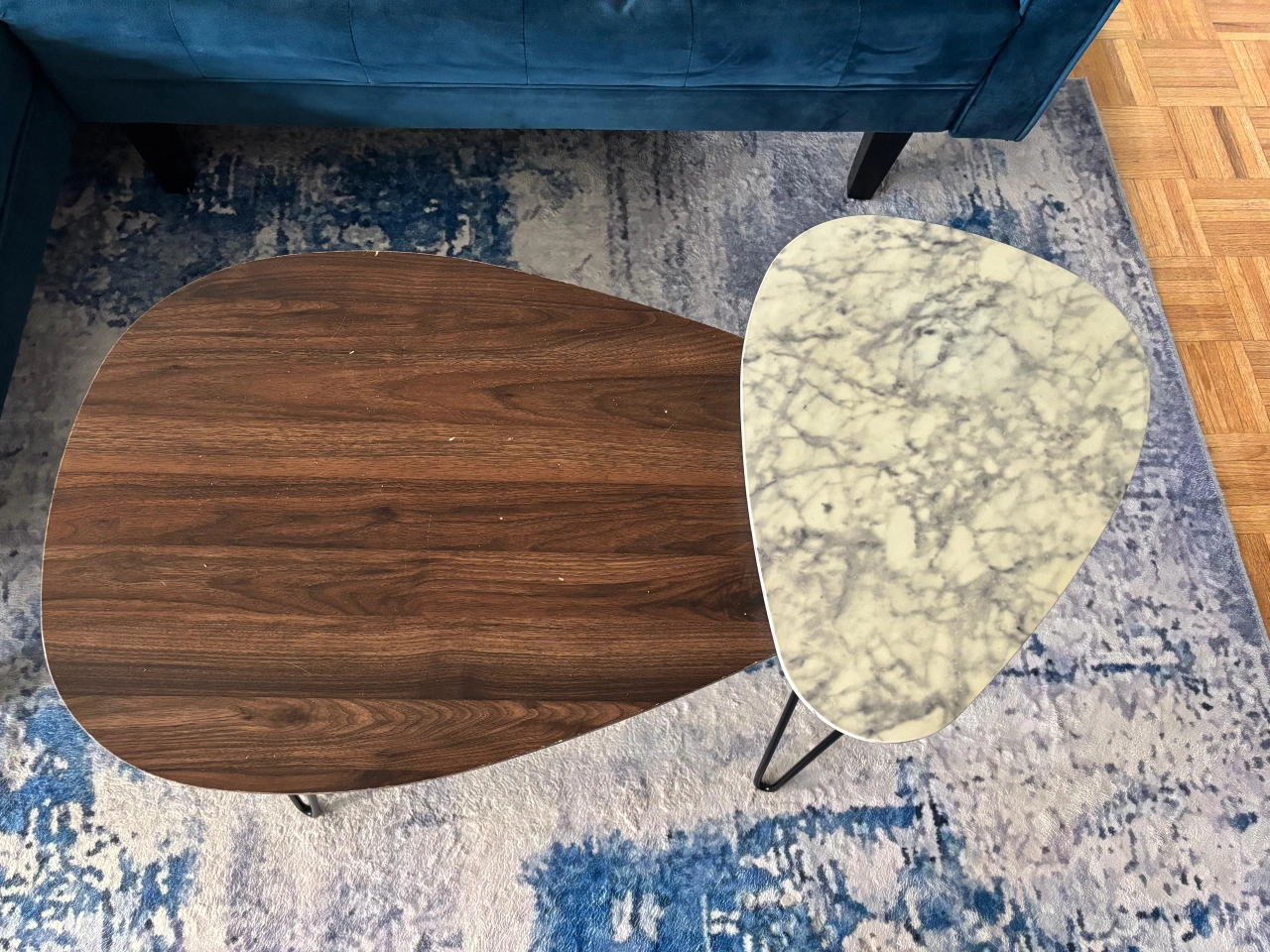 Selling a set of mid-century modern nesting coffee tables! One table features a rich wood-grain finish, while the other has a stylish faux-marble top. These tables are perfect for adding a touch of retro flair to your living space and are great for saving space when nested together