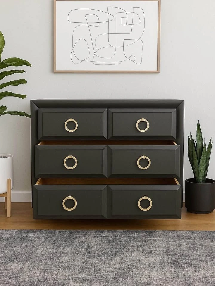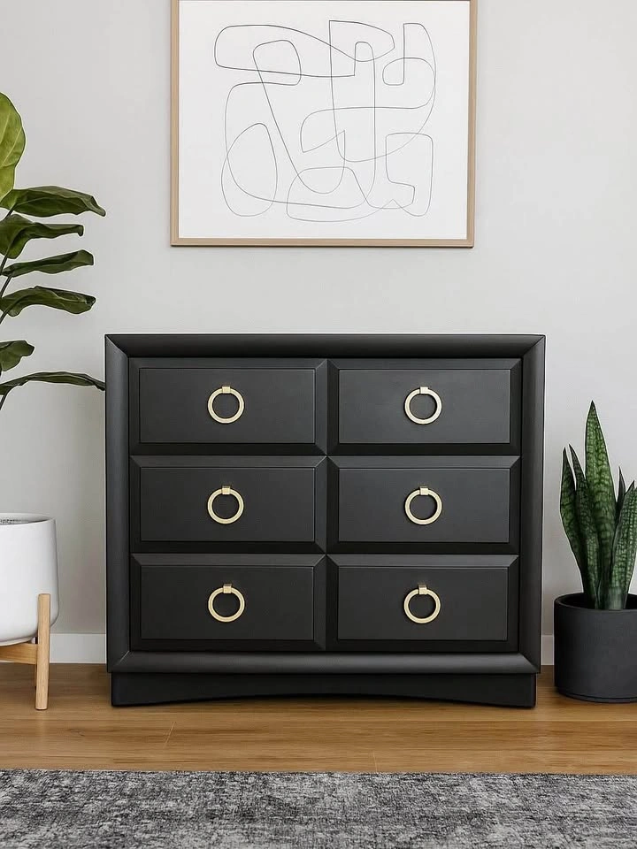 65Beautiful solid wood Widdicomb mid-century dresser, freshly refinished in a smooth matte black with gold hardware. It’s a vintage piece with amazing quality and clean modern lines — now updated with a bold, timeless look. Details: • Authentic Widdicomb Furniture Co. mid-century piece (1950s–60s) • Original Price: $3500+ • Refinished by hand — matte black paint with gold ring pulls • Three spacious drawers with solid wood interiors • Classic tapered legs and sleek, minimal design on wheels • Dimensions: 36 length, 20 width, 33 height This dresser adds character and warmth to any space — perfect for a bedroom, entryway, or as an accent piece in a modern home. 💰 Asking: $900 (or best offer) 📍 Located in: Ville St-Laurent 🚗 Pickup only — I can help load it