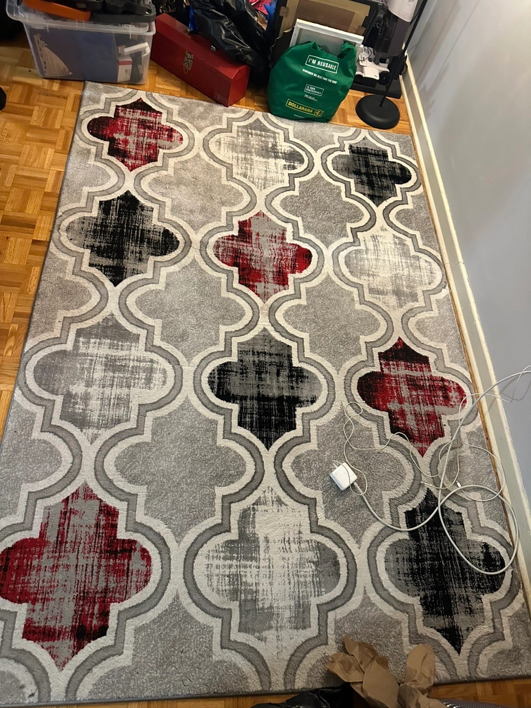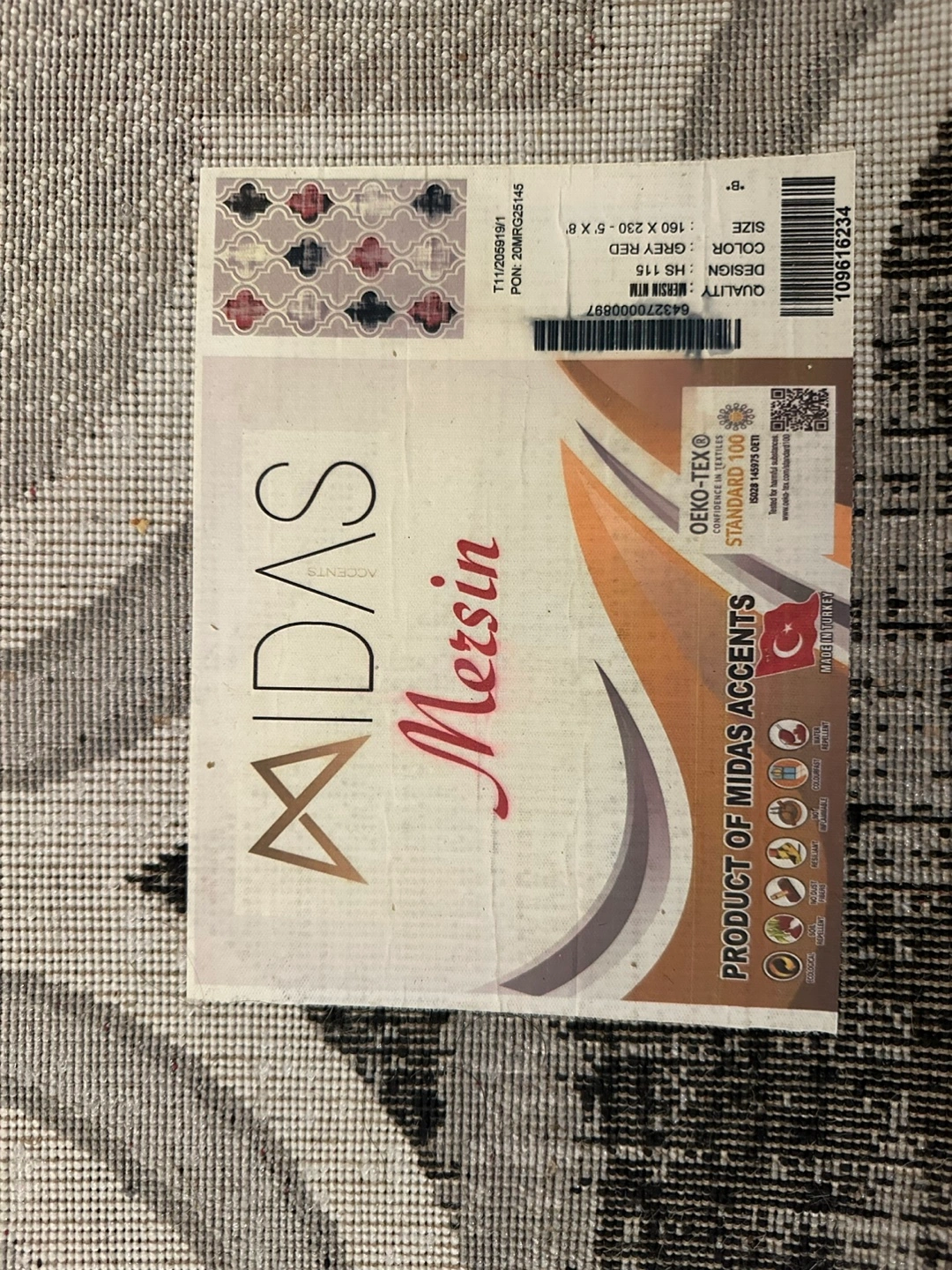 Here's a Midas Mersin rug that would look great in any room! It's grey and red, and measures 5' x 8'