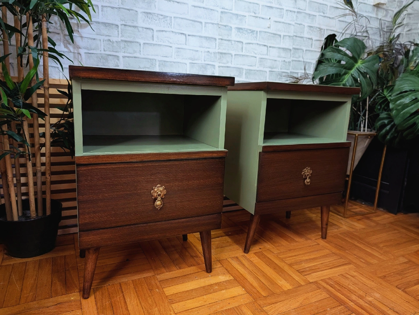238MCM Nightstands (1960 Quebec) Beautiful wooden pieces with bare patterned wood drawers and Earthy Sage. Lots of storage and golden rare medallion handles from the 1930s. Very rare find. See makers mark. Truly more beautiful than photos. One of a kind redesign! Measures: 24.75H x 16.75W x 13.75 D Delivery Cost = Location ๐ Loads more items posted. Asking if available / low offers will not be responded to.