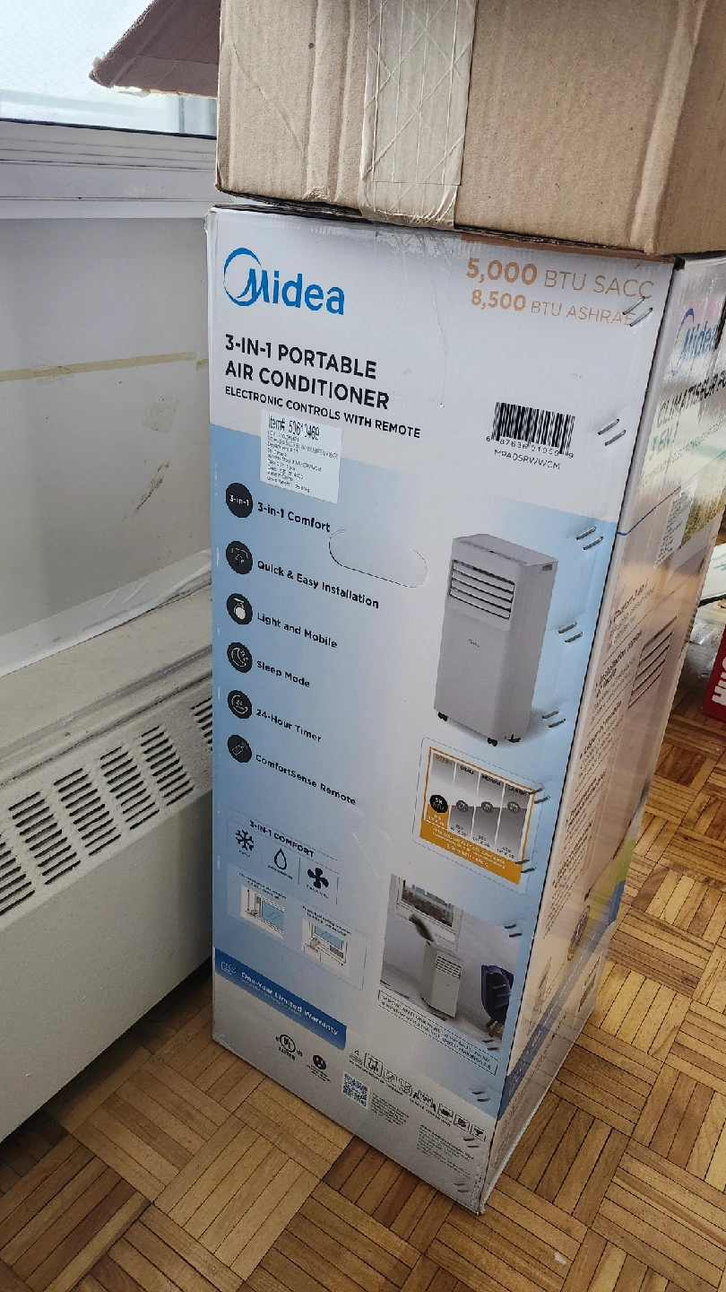10Selling a Midea 3-in-1 portable air conditioner! It has electronic controls with a remote. The unit offers 3-in-1 comfort, quick and easy installation, and is light and mobile. It also features a sleep mode, 24-hour timer, and ComfortSense remote. It's a 5,000 BTU SACC / 8,500 BTU ASHRAE unit Used only multiple times with care