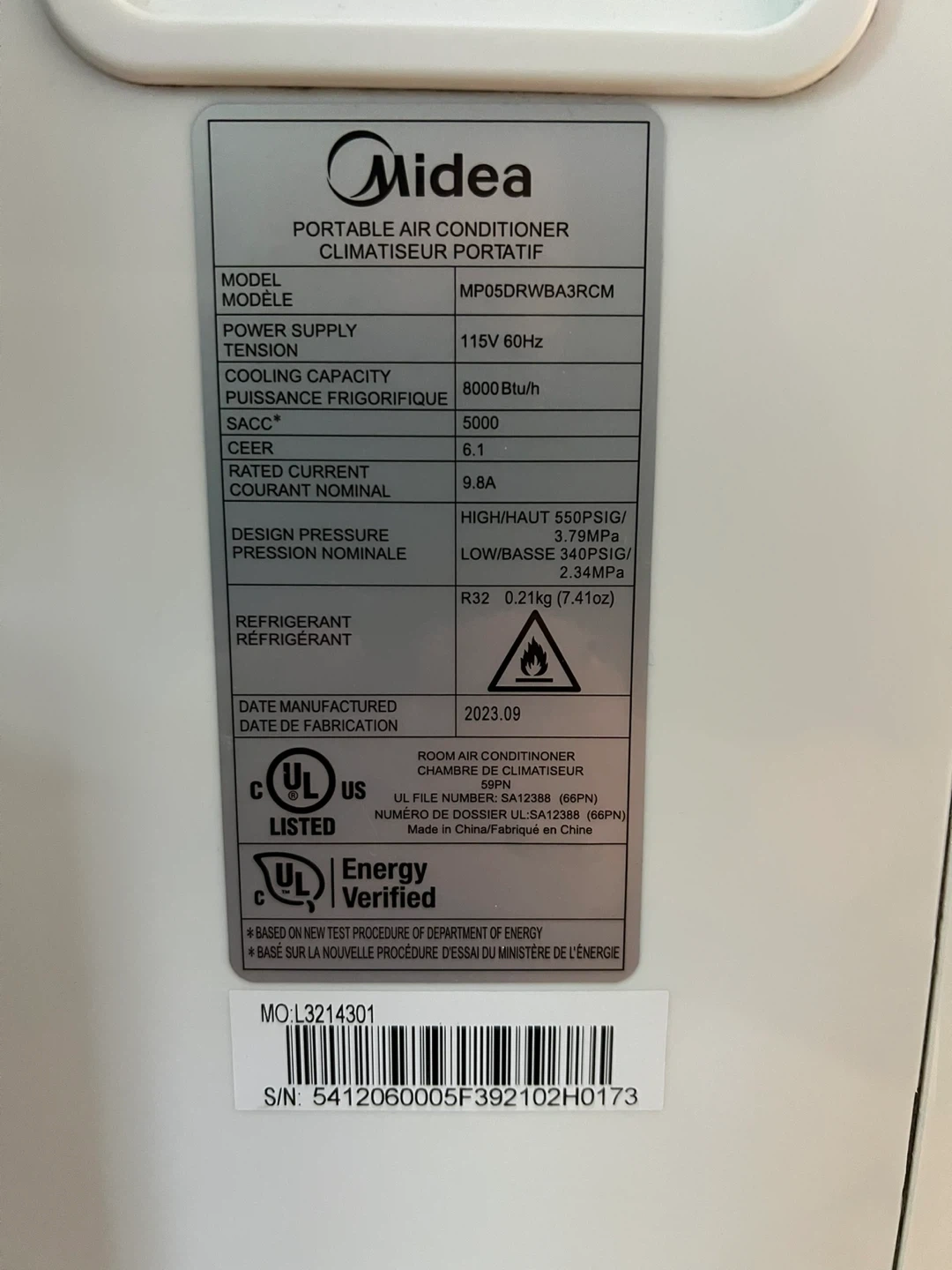 Selling a Midea portable air conditioner, model number MP05DRWBA3RCM. It has a cooling capacity of 8000 Btu/h and uses R32 refrigerant. The date of manufacture is September 2023. I have three of them. If you purchase more than one, I will give a discount. If you purchase all three a larger discount. Thank you.