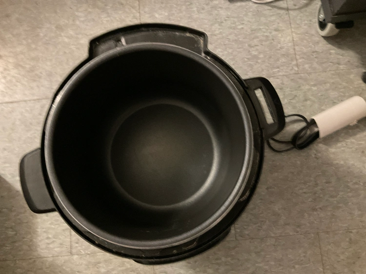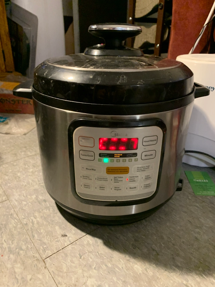 Working good as pressure cooker, bake, meat. Pressure valve direction is opposite to mark. Timer start at 2 hours. As is.