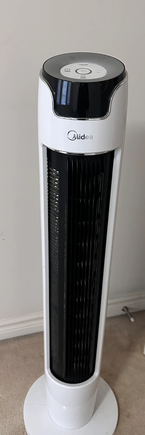 Selling a Midea tower fan in white. It's in great working condition and perfect for keeping cool during the summer months! It has a Type G plug as well.