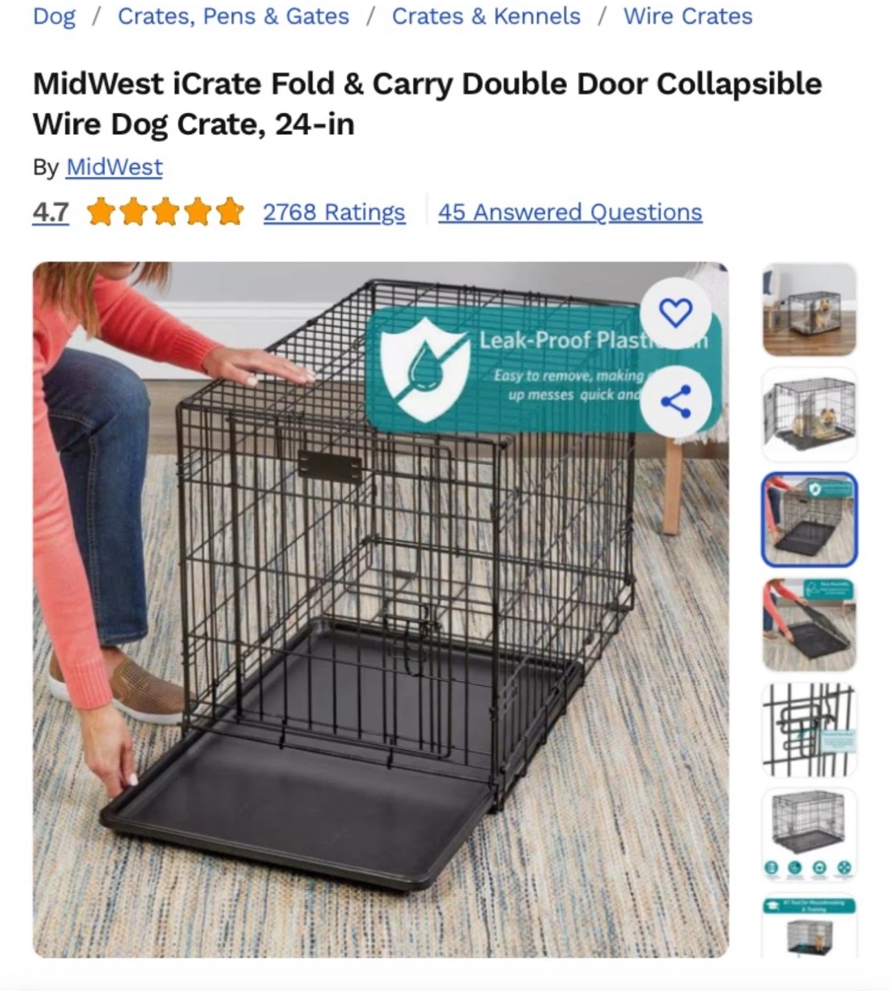 15Selling a MidWest iCrate Fold & Carry Double Door Collapsible Wire Dog Crate, size 24-in. It's in great shape and features a leak-proof plastic pan that's easy to remove, making clean-up quick and simple. Perfect for your furry friend!