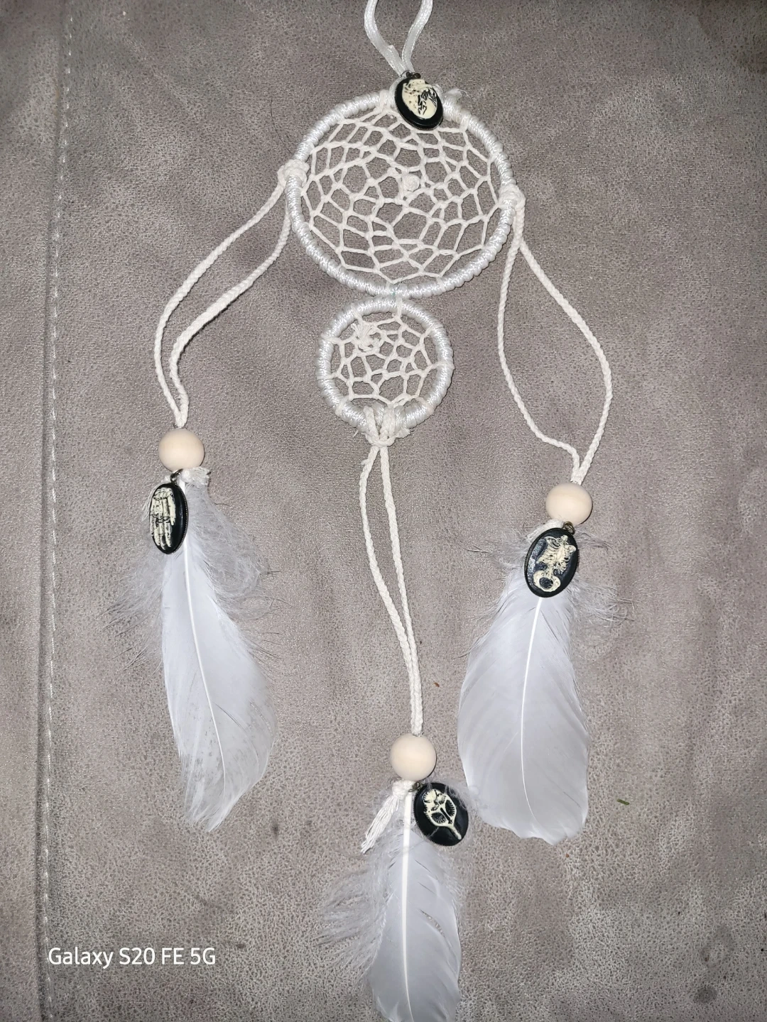 This dreamcatcher features two woven hoops with white string and decorative feathers. It's adorned with wooden beads and black oval charms, each with a unique design. A lovely decorative piece!