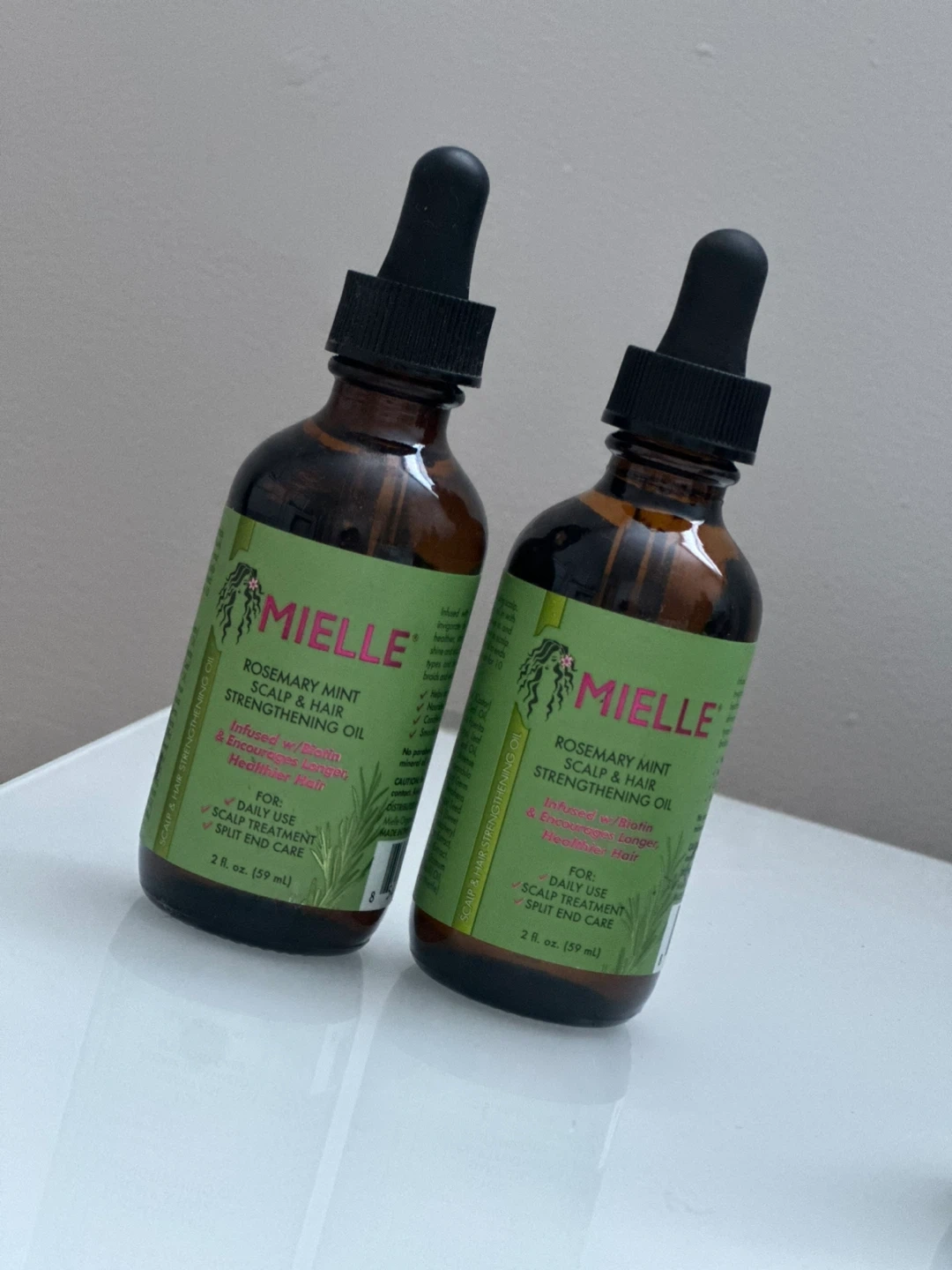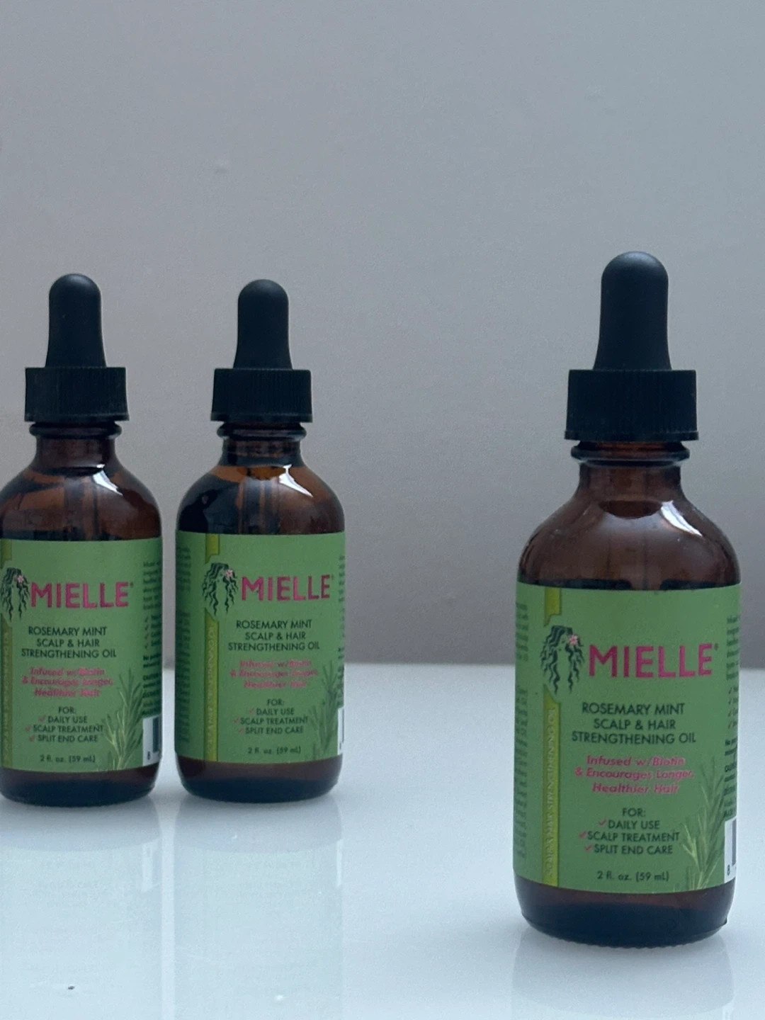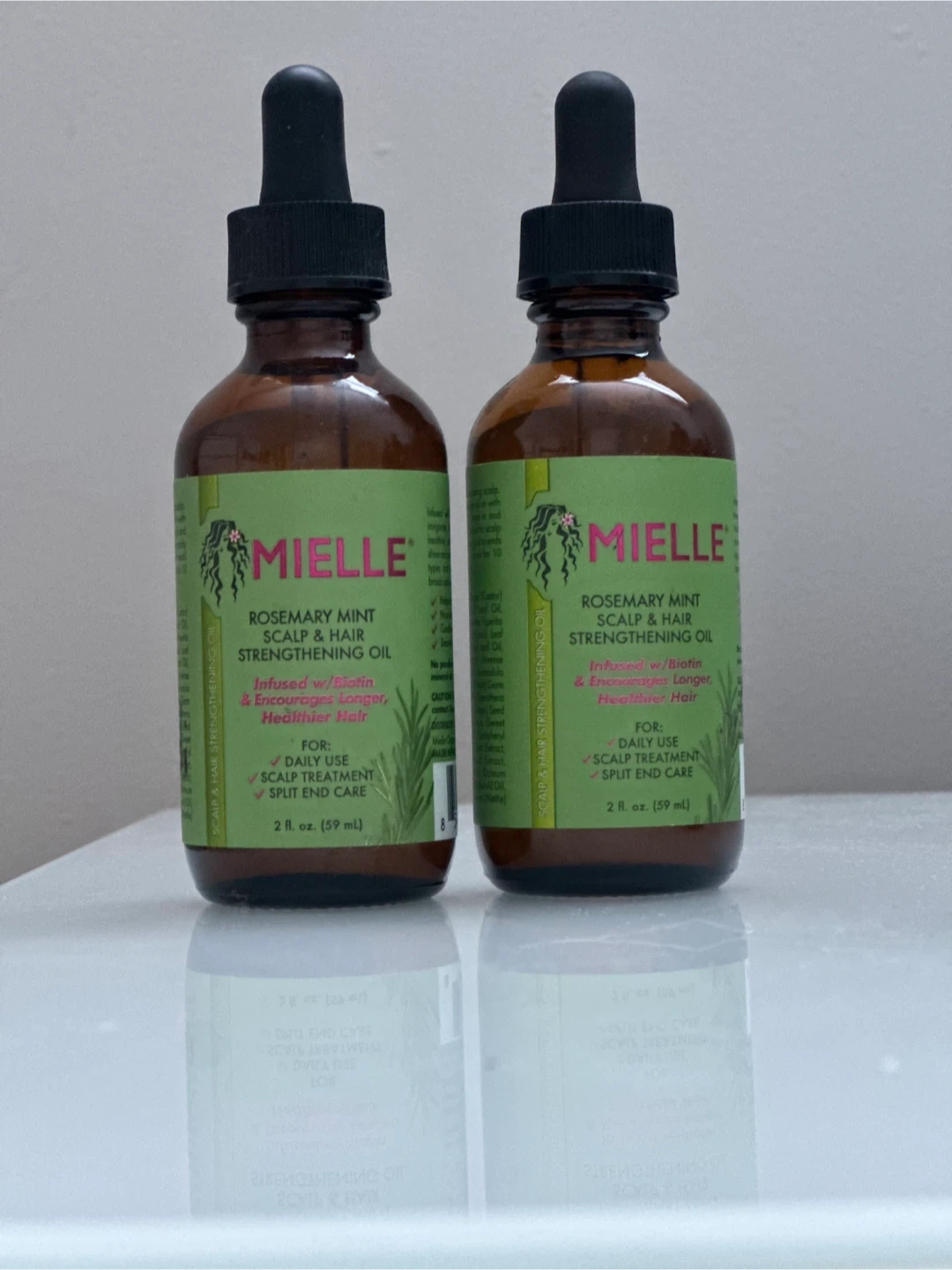 75Mielle Rosemary Mint Scalp & Hair Strengthening Oil, infused with biotin to encourage longer, healthier hair! Perfect for daily use and scalp treatment, it also helps with split end care. Each bottle contains 2 fl oz (59 ml). 2 Available One for $13 or 2 for $20