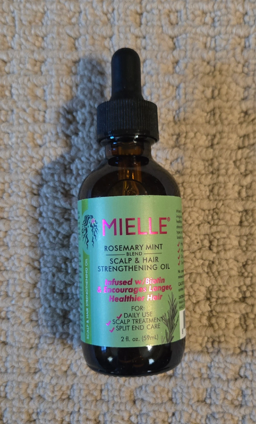 Here's a bottle of Mielle Rosemary Mint Scalp & Hair Strengthening Oil! It's infused with rosemary, mint, and biotin to invigorate the hair and scalp, encouraging healthier, stronger, longer hair. Great for all hair types and textures, including braids, weaves, and chemically treated hair. It helps improve length retention, invigorates and nourishes hair follicles, conditions dry scalp, and smooths split ends. This is a 2 fl oz (59mL) bottle