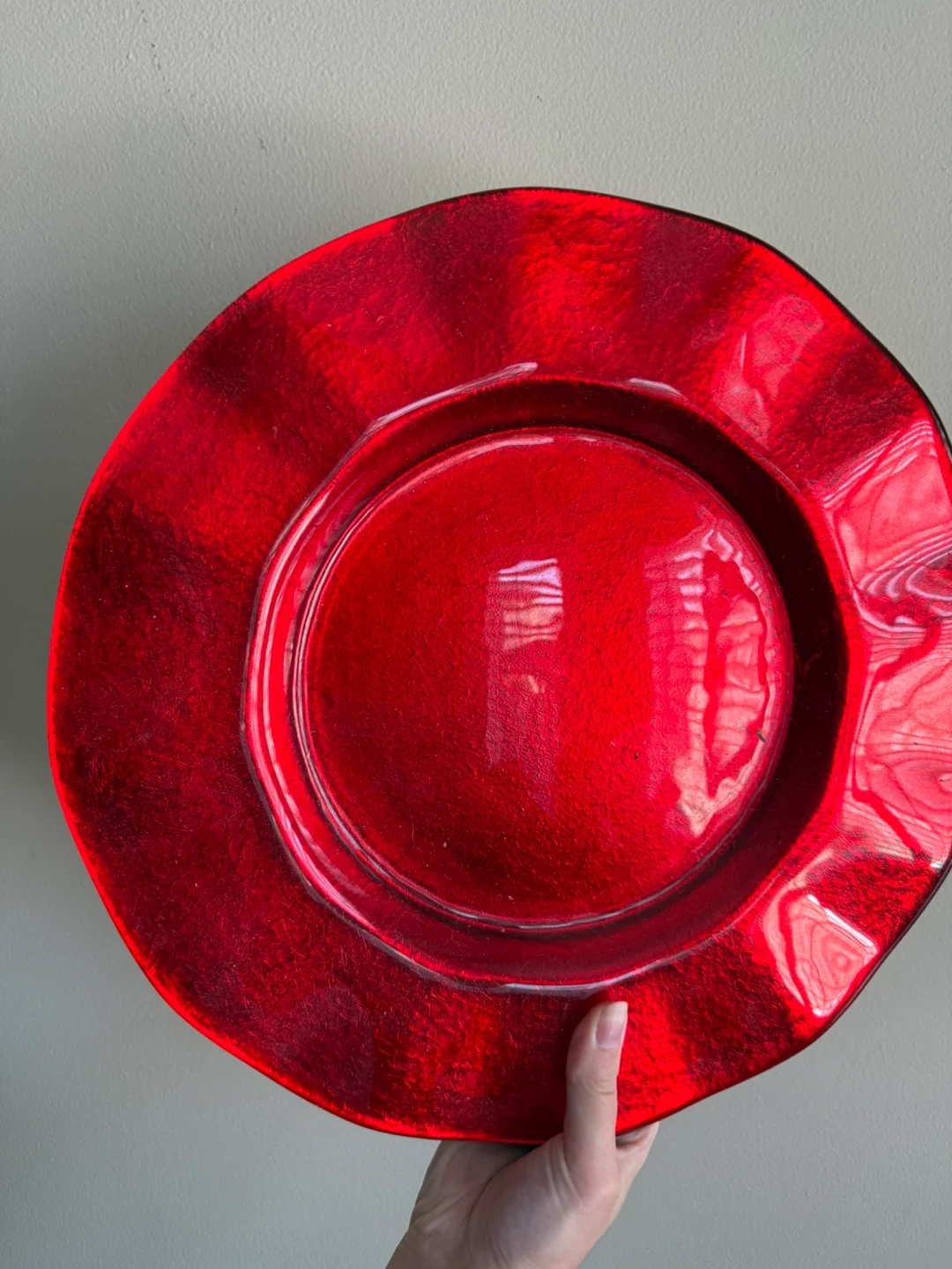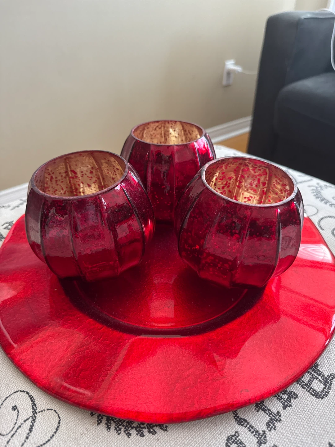 🧡 3 Red Glass Votive Holders & Red Charger Plate