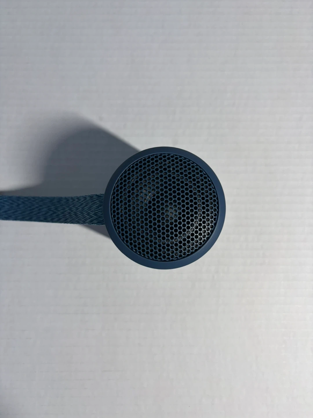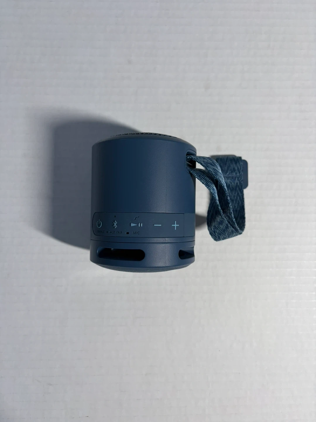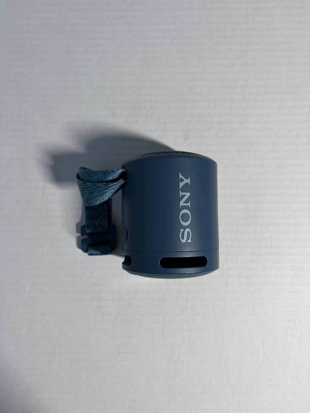 This is a blue Sony portable Bluetooth speaker. It's compact and comes with a handy strap. Perfect for taking music on the go!