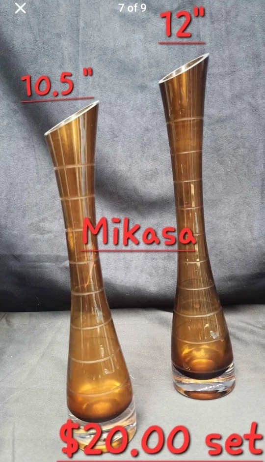 15Selling a set of Mikasa glass vases. One is 10.5 inches tall, and the other is 12 inches tall. They're a beautiful addition to any home!