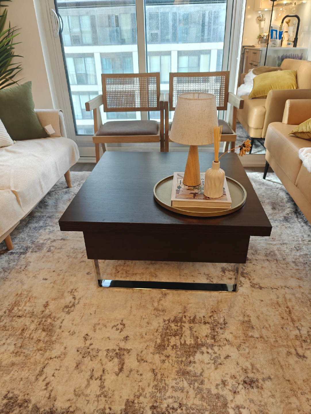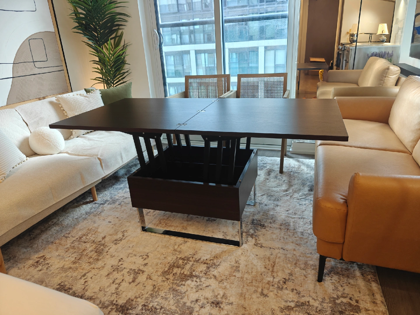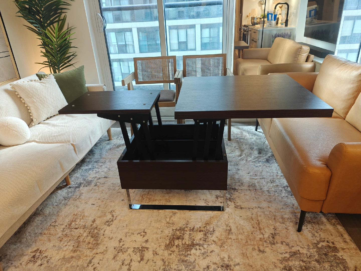 56Selling small space plus Milan coffee dining table convertible in walnut color. Dimensions - Coffee Table Dimensions: 29"W x 29"D x 18"H Dining Table Dimensions: 59"W x 29"D x 29"H https://www.smallspaceplus.com/collections/coffee-tables-1/products/milan-convertible-coffee-dining-table