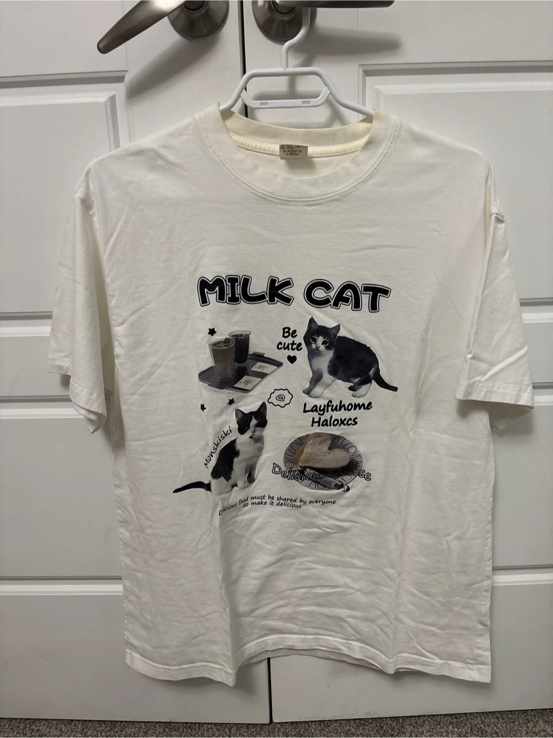 10Cute Milk Cat graphic tee! The shirt features adorable cat designs with a playful, cartoonish style. It's a comfortable and casual piece, perfect for everyday wear. The material feels soft and breathable, making it great for warmer weather. It's in excellent condition and ready for a new home