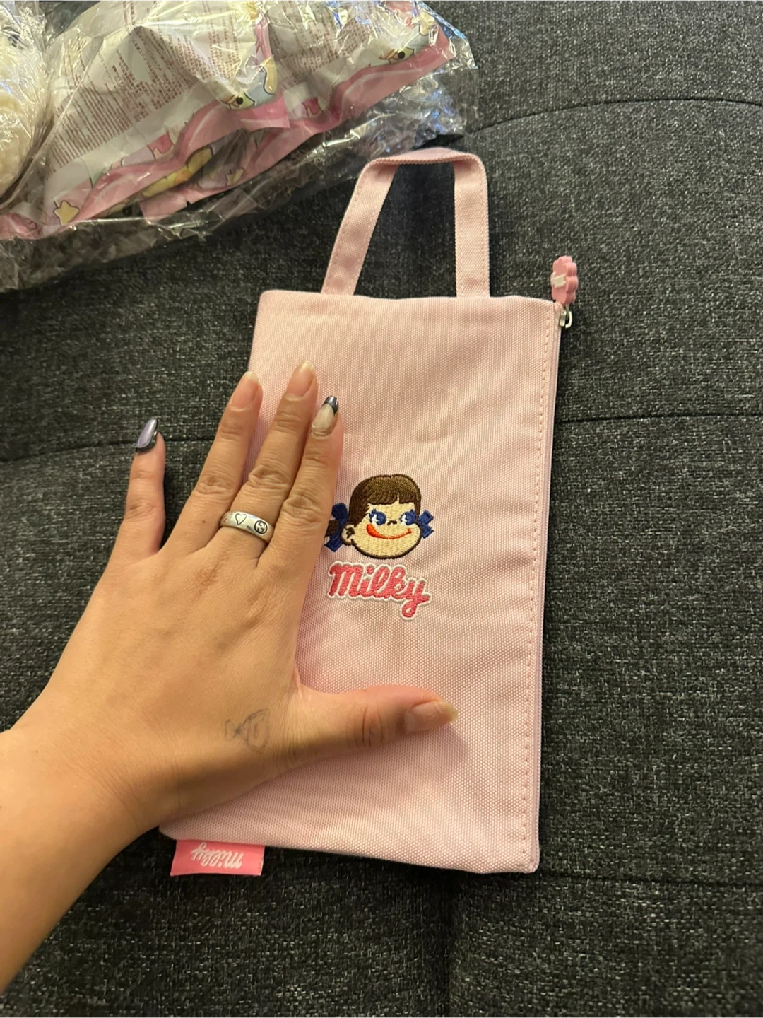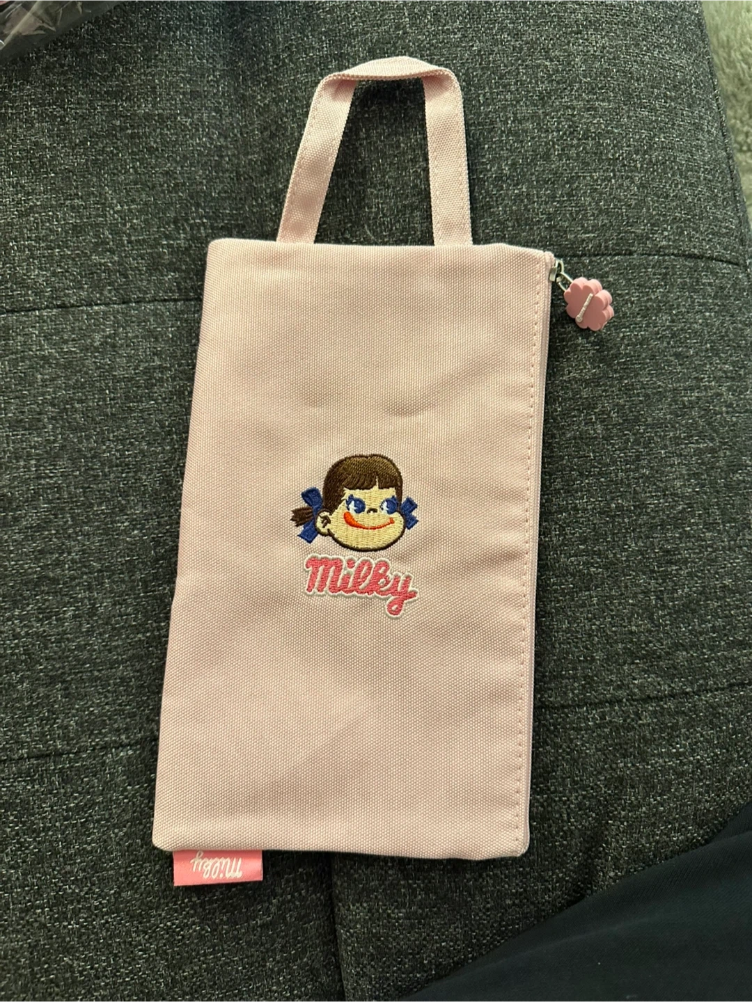 119Super cute Milky Peko-chan pouch in a lovely pink colour! It's made of canvas and has a handy handle for carrying. Perfect for storing your essentials!