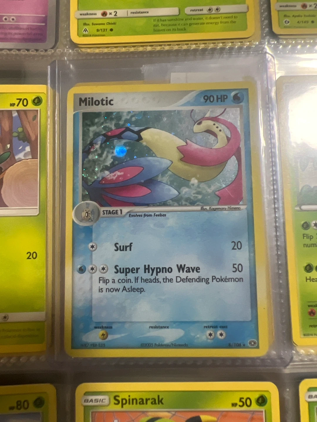 10Selling a Milotic Pokémon card. It has two attacks: Surf and Super Hypno Wave! It evolves from Feebas.