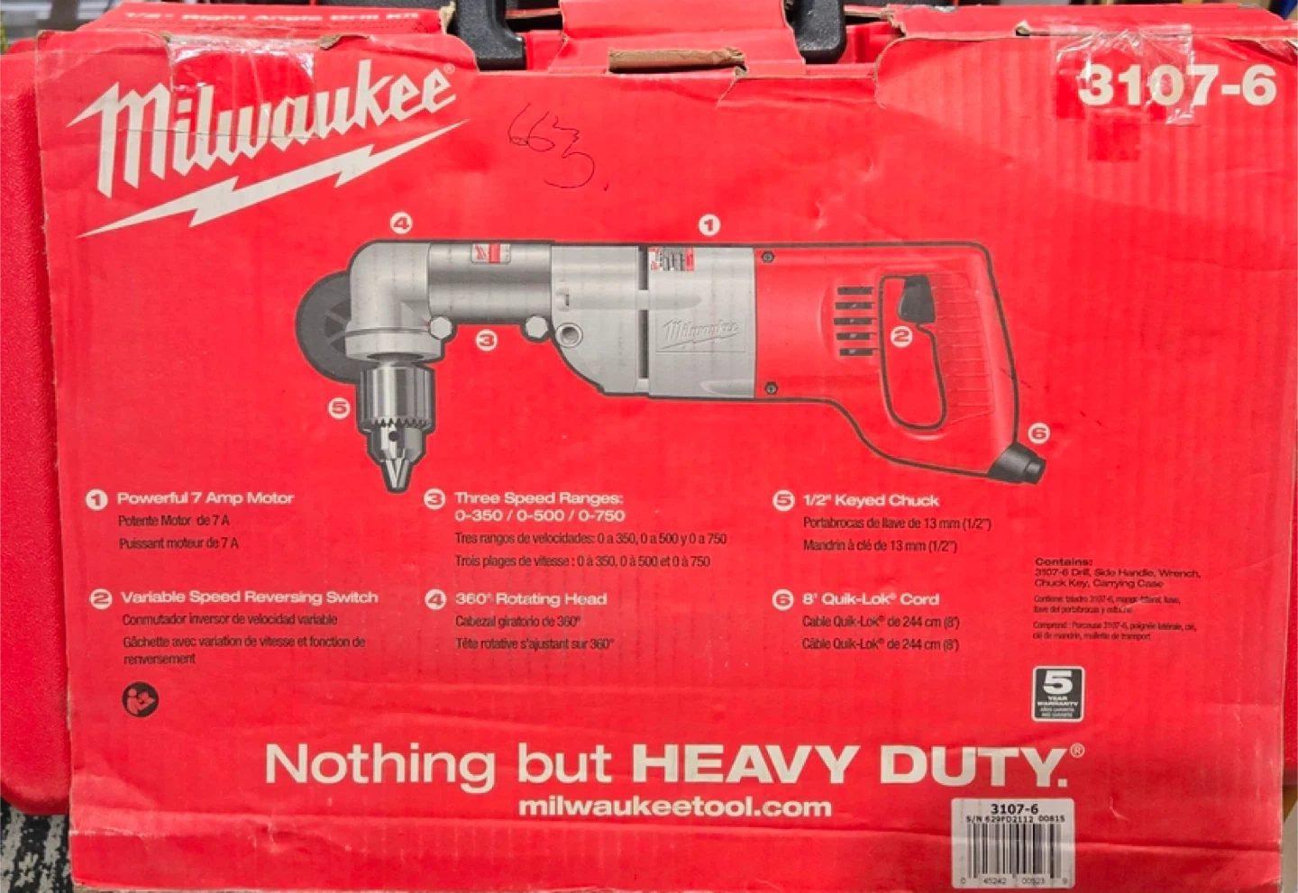 1000+This heavy-duty drill features a powerful 7 Amp motor and three-speed ranges (0-350 / 0-500 / 0-750). It also has a variable speed reversing switch and a 360° rotating head. The 1/2" keyed chuck and 8' Quik-Lok cord make it easy to use. This kit includes the drill, side handle, wrench, chuck key, and carrying case, all in the original box!