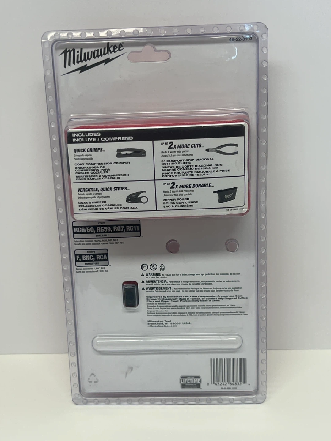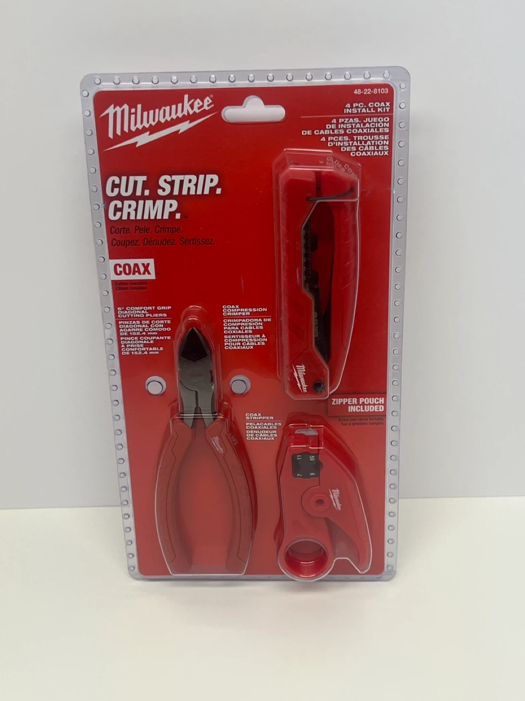84I'm selling a brand new Milwaukee 4-piece coax installation kit! It includes a coax compression crimper, coax stripper, and 6" comfort grip diagonal pliers. A zipper pouch is also included for easy storage and transport