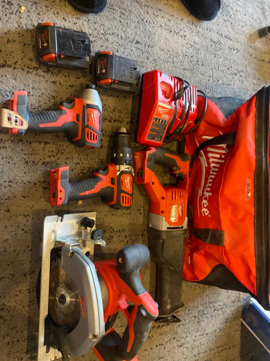 Selling a set of Milwaukee cordless power tools. This set includes a variety of tools, batteries, and a charger, all in a Milwaukee tool bag. Perfect for any job site or DIY project!