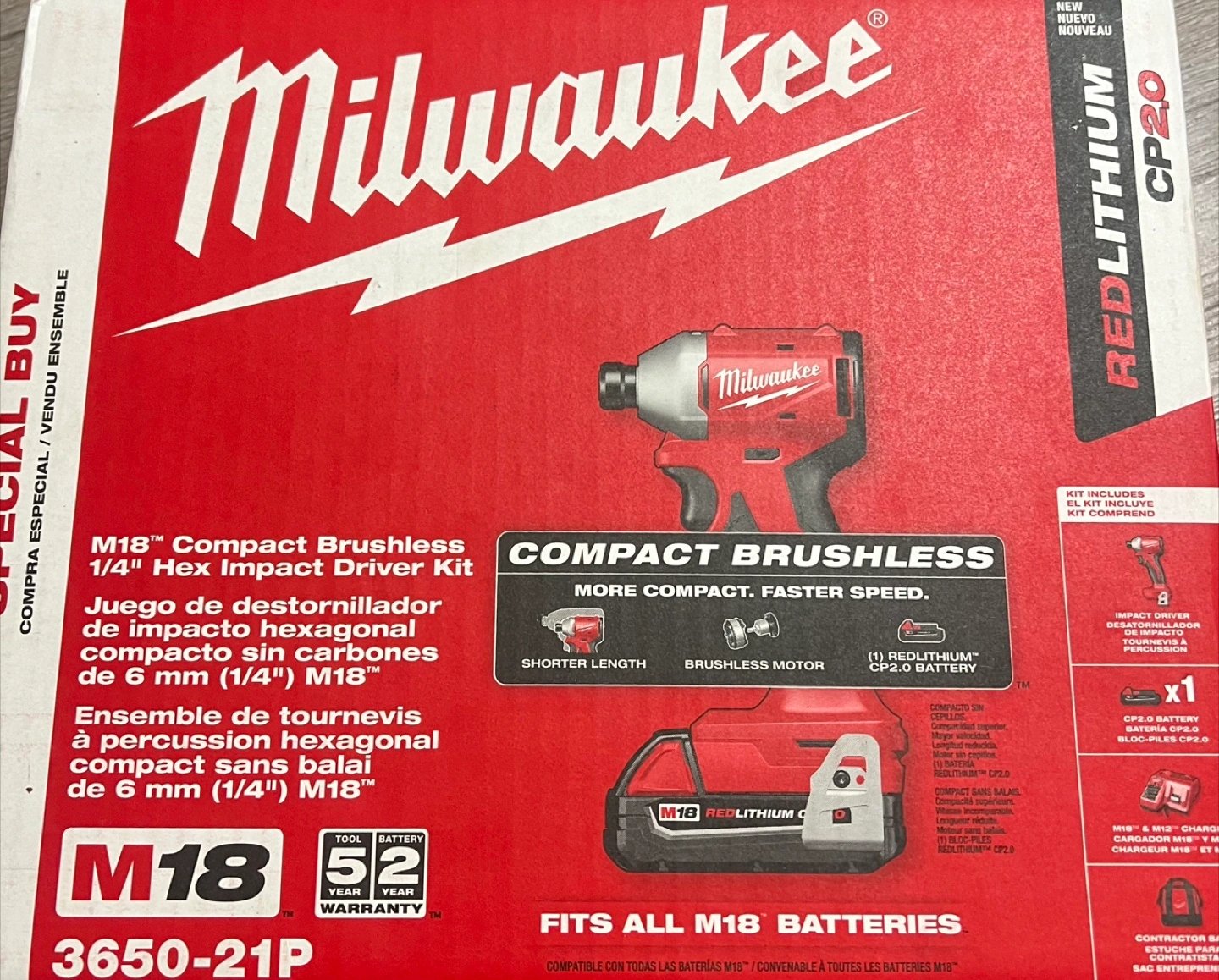 96Selling a Milwaukee M18 Compact Brushless 1/4" Hex Impact Driver Kit. This kit is designed for more compact and faster speed with a shorter length and brushless motor. It fits all M18 batteries and includes one RedLithium CP2.0 battery and an impact driver. The kit also comes with a contractor bag.