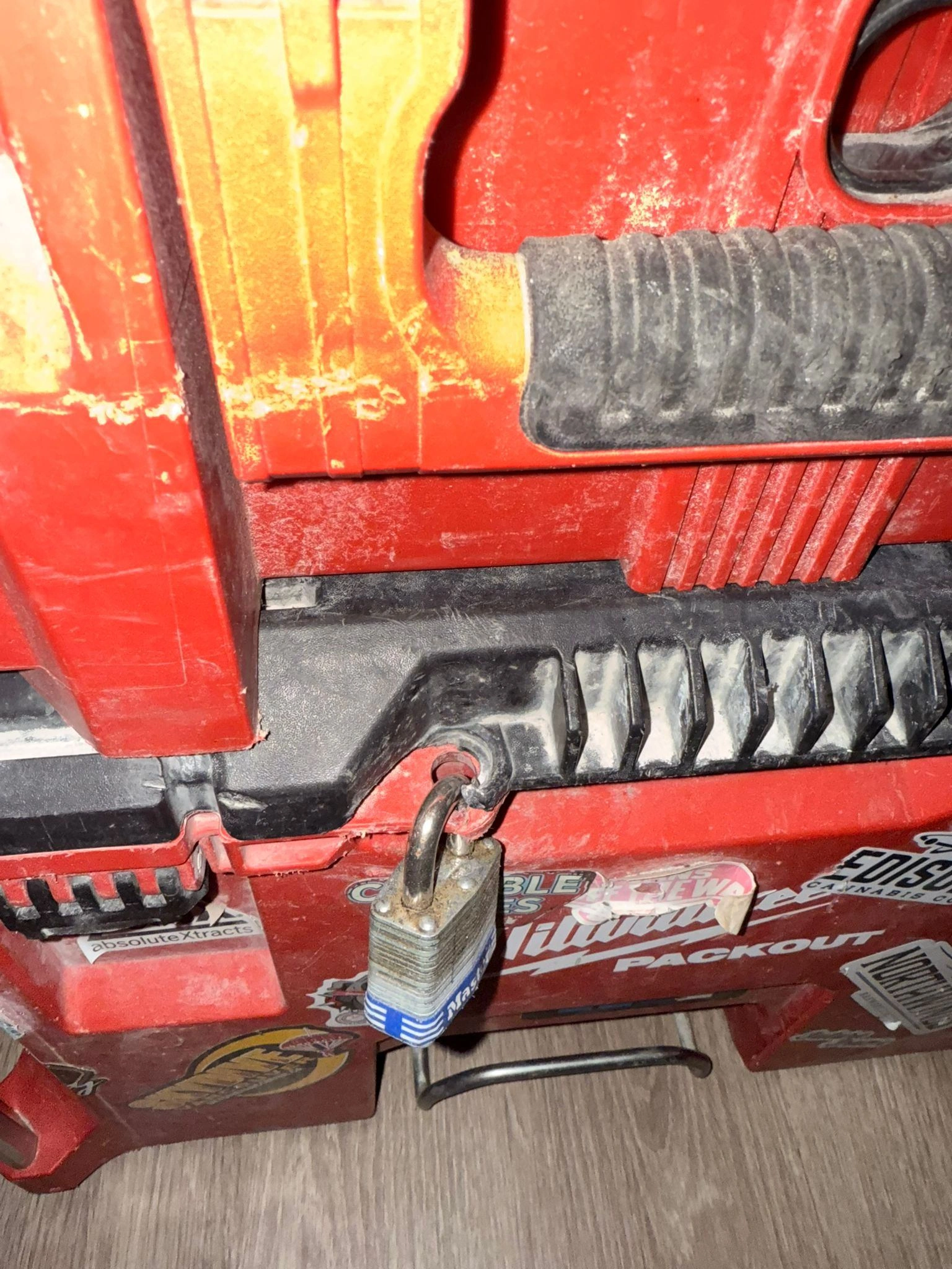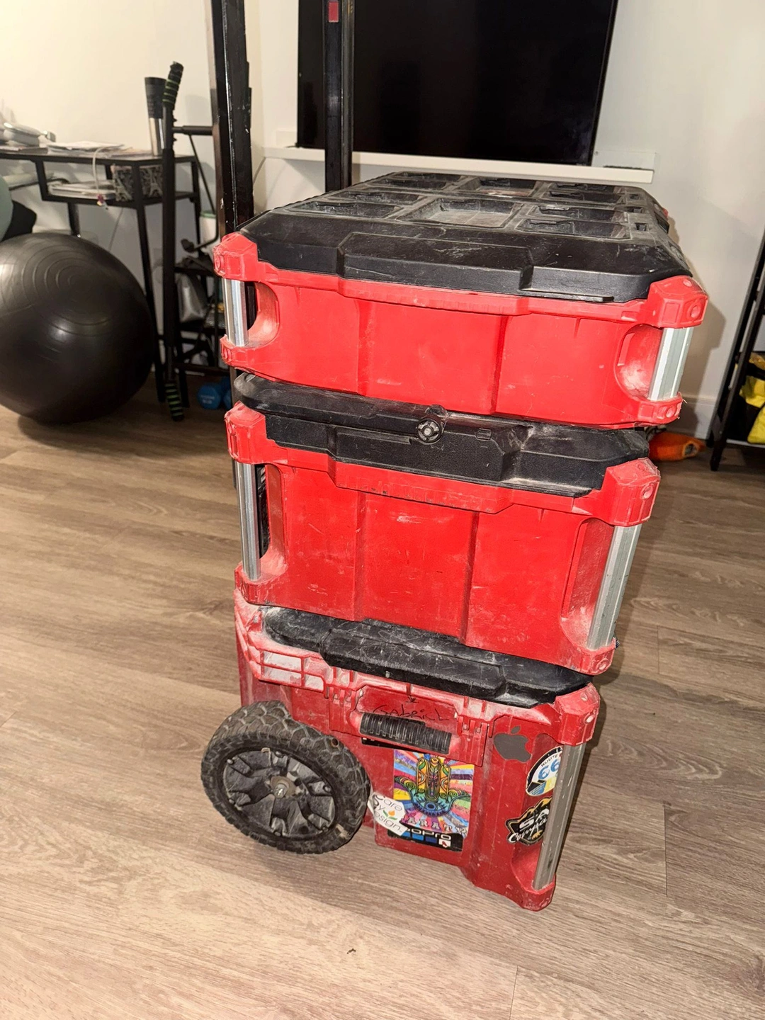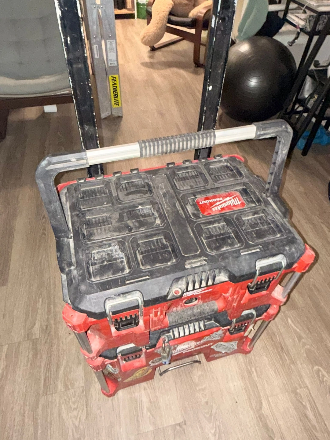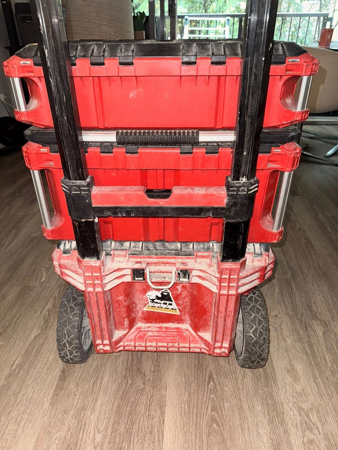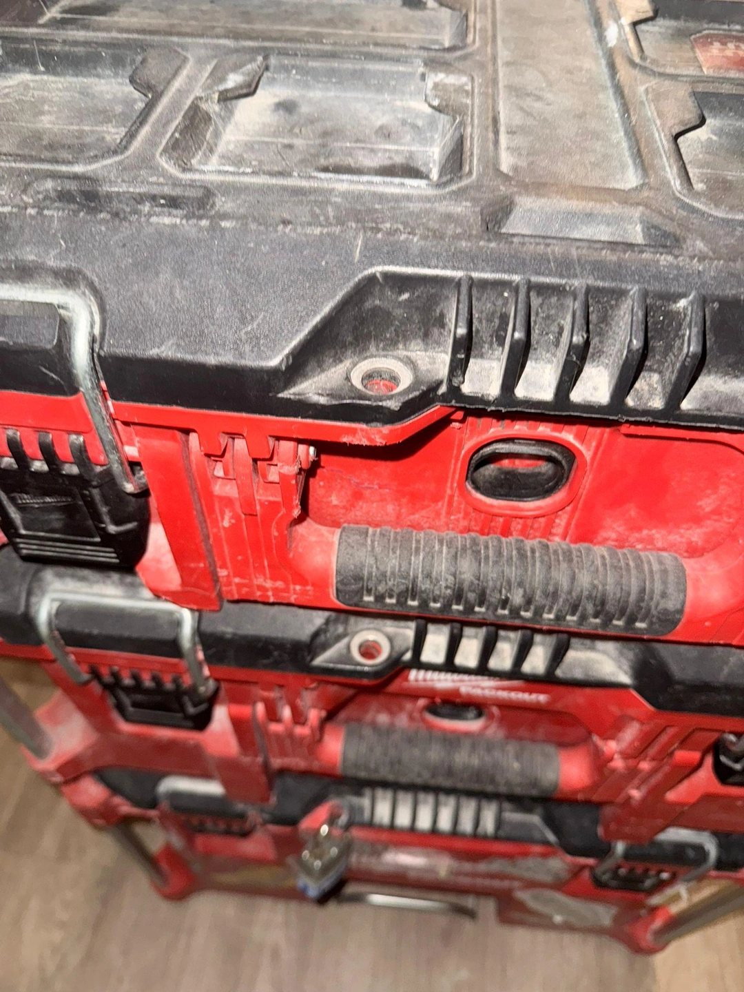 83Description Selling my Milwaukee PACKOUT 22-inch Rolling Tool Box, part of the legendary modular storage system. This is the large base unit with wheels and handle, perfect for contractors, DIYers, and tradespeople who want durable, stackable tool storage. Everything works great — wheels roll smoothly, handle extends perfectly, and latches are solid. Only flaw: the padlock latch is broken, so it can’t be locked with a padlock (see photo). Otherwise, it’s in very good shape with normal signs of use. Highlights Heavy-duty construction built for jobsite abuse Stackable modular design fits all PACKOUT components Industrial-grade extension handle and all-terrain wheels Spacious 22" interior for large tools, gear, or accessories Great deal if you don’t need the locking function Why it’s a Deal New ones go for over $438+ after tax — grab this one for a fraction of the price. Works perfectly for anyone who wants the PACKOUT system without paying full retail.