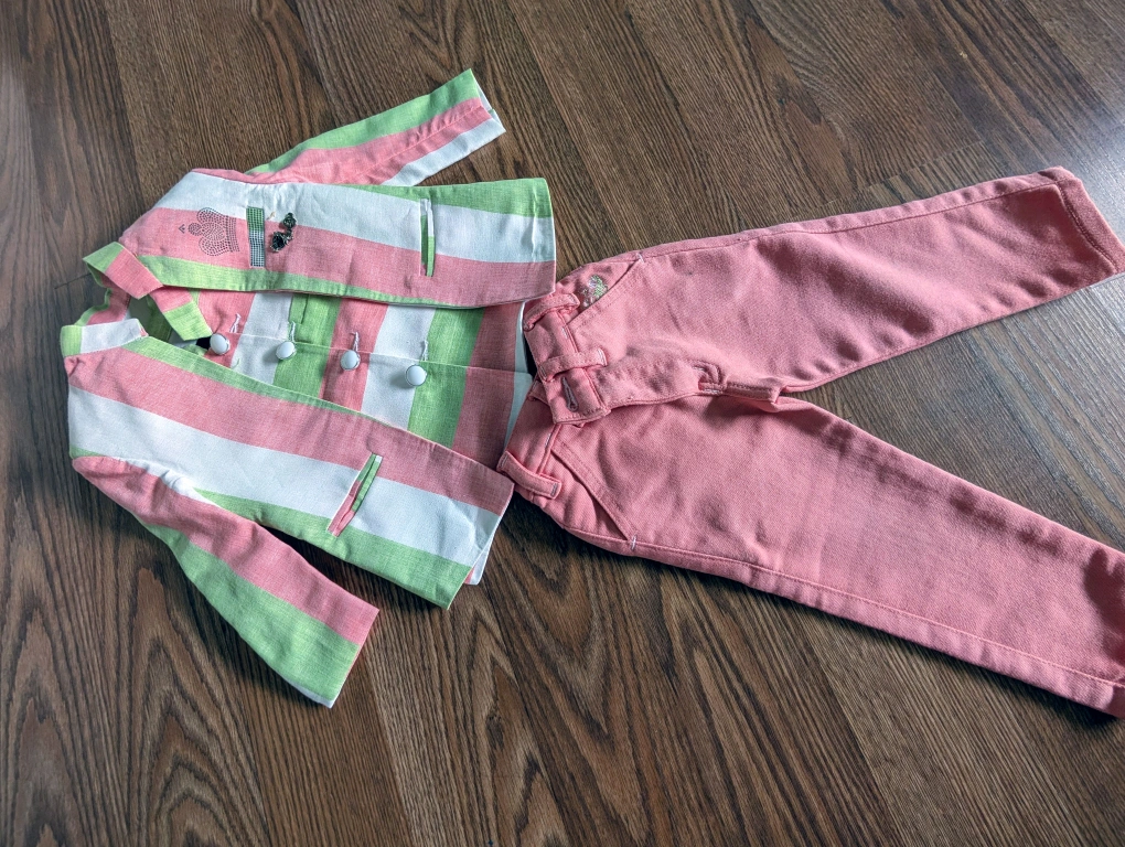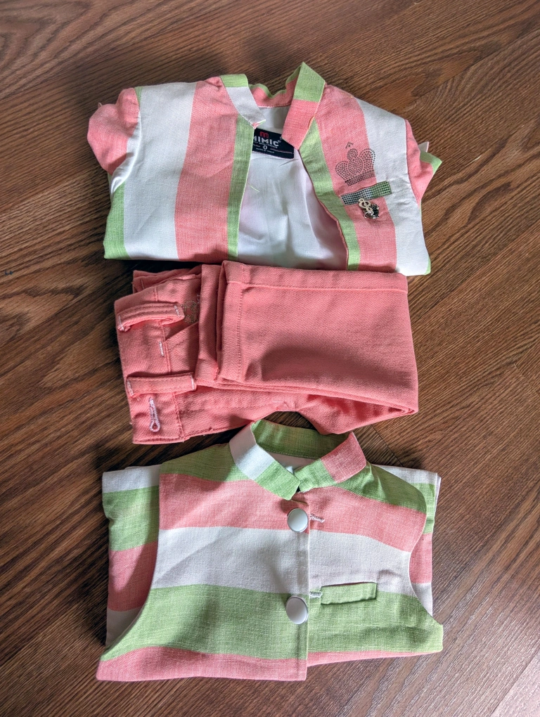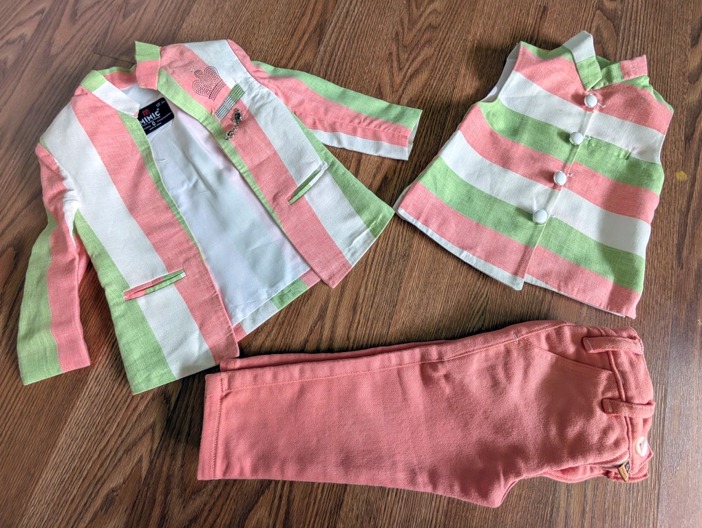 This adorable Mimic B. baby outfit includes a blazer, vest, and pants! The blazer and vest feature a cute striped pattern in white, light green, and coral, while the pants are a solid coral colour. Perfect for a special occasion or just looking stylish!