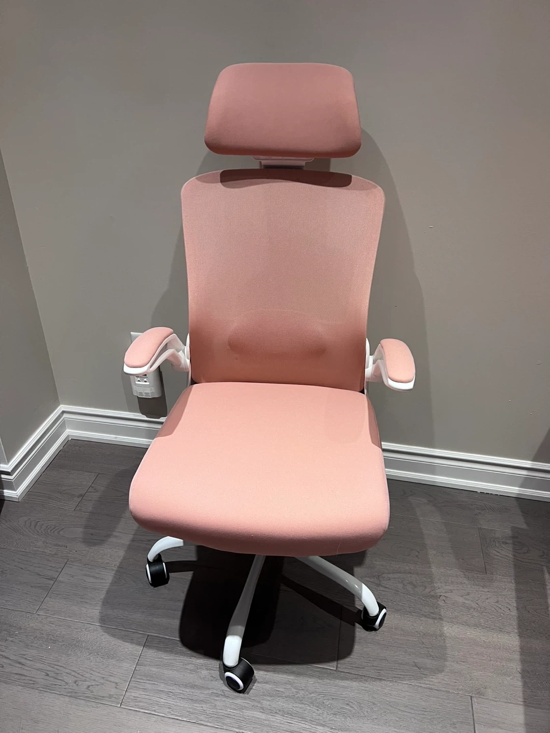 Selling a Mimoglad office chair in a lovely pink colour! This comfy desk chair features a high back, adjustable lumbar support, and a headrest. It also has flip-up armrests, perfect for guitar playing or just relaxing while you work. It supports up to 300 lbs and includes all the tools for easy assembly