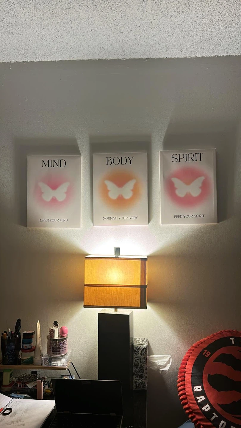 15Selling a set of three wall art pieces. They feature the words 'Mind,' 'Body,' and 'Spirit' with a butterfly design. They'll add a calming touch to any room