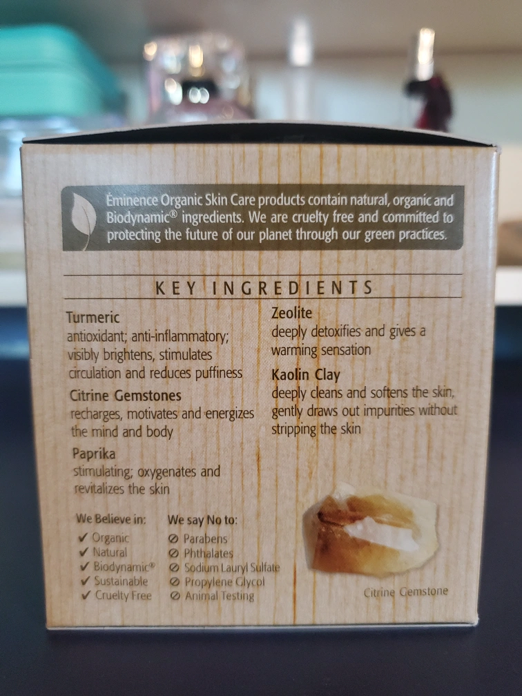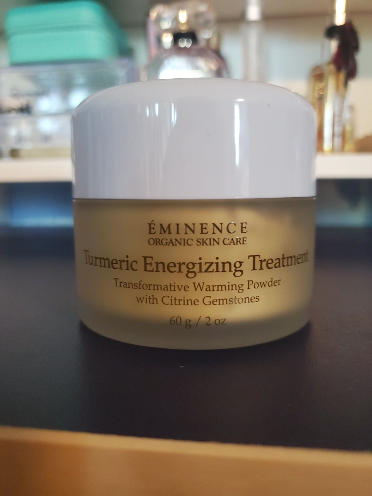 20Selling an Éminence Organic Skin Care Turmeric Energizing Treatment! This transformative warming powder contains citrine gemstones and is suitable for all skin types. It comes in a 60g / 2 oz container. Key ingredients include turmeric, zeolite, kaolin clay, and citrine gemstones. It is cruelty free and contains natural, organic and Biodynamic ingredients