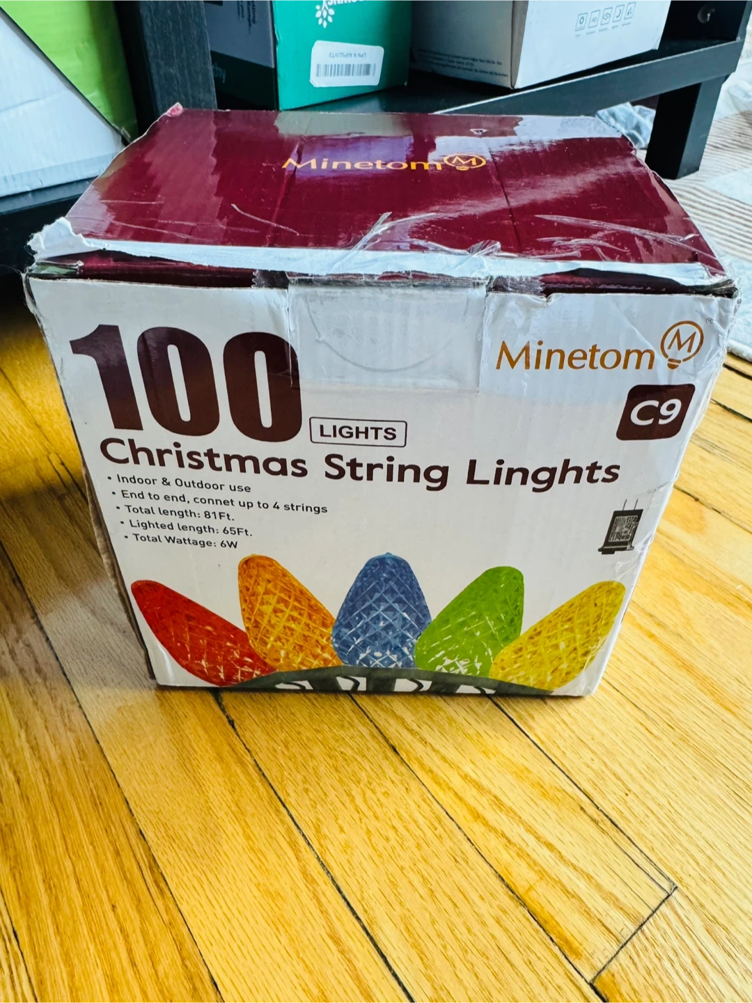 69Selling a box of Minetom C9 Christmas string lights. They are suitable for both indoor and outdoor use. You can connect up to 4 strings end to end. The total length is 81 feet, with a lighted length of 65 feet, and a total wattage of 6W