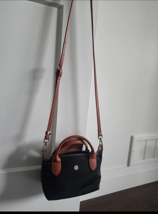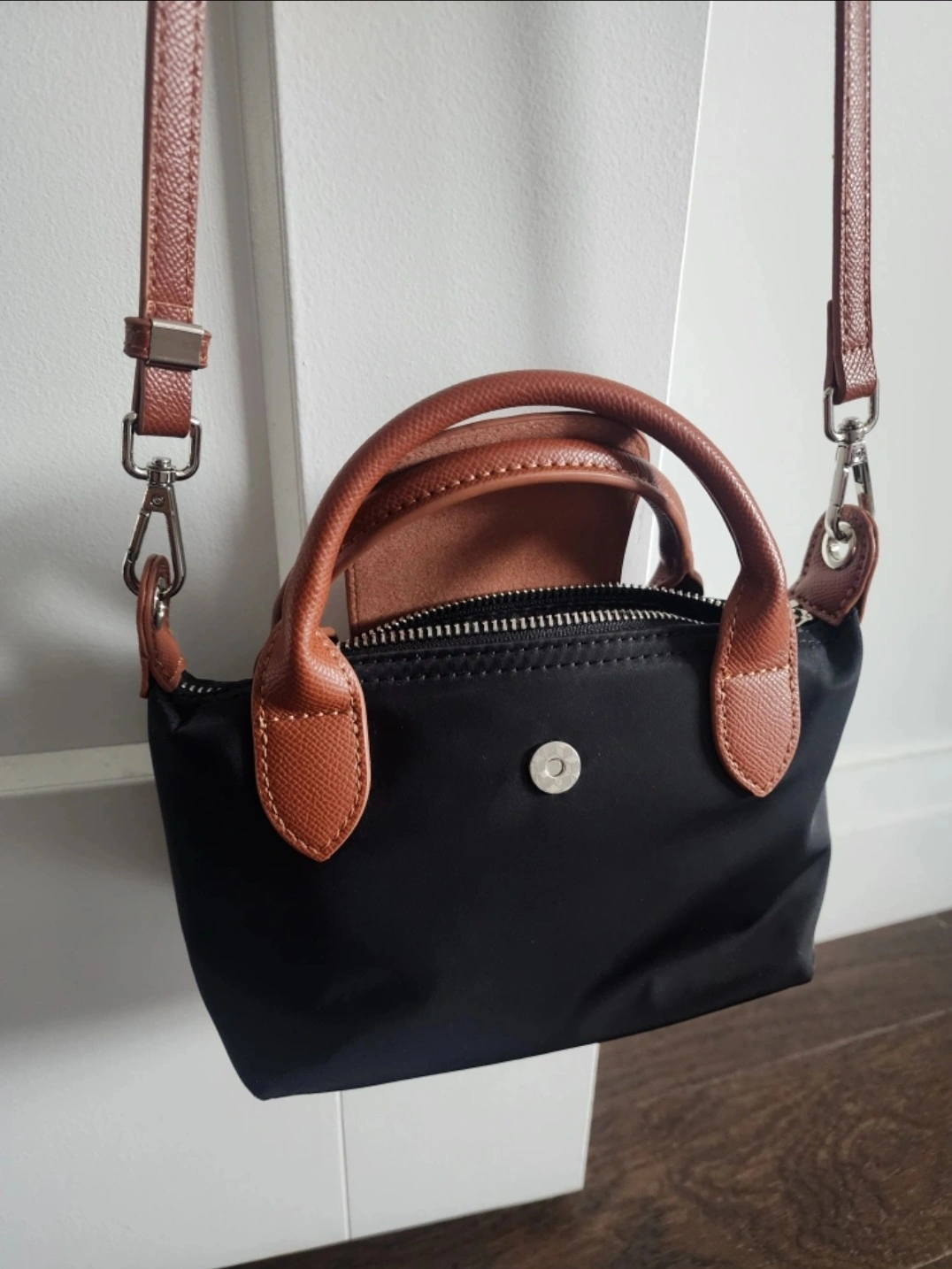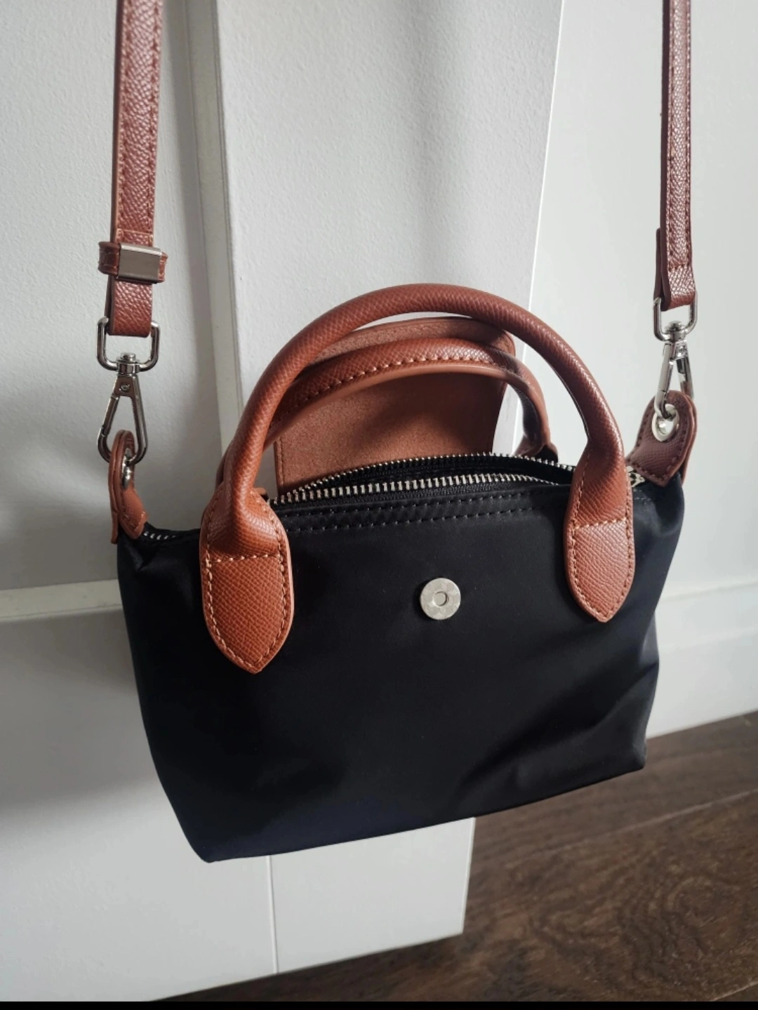 This cute little bag features brown leather handles and an adjustable shoulder strap. It's perfect for carrying your essentials in style!