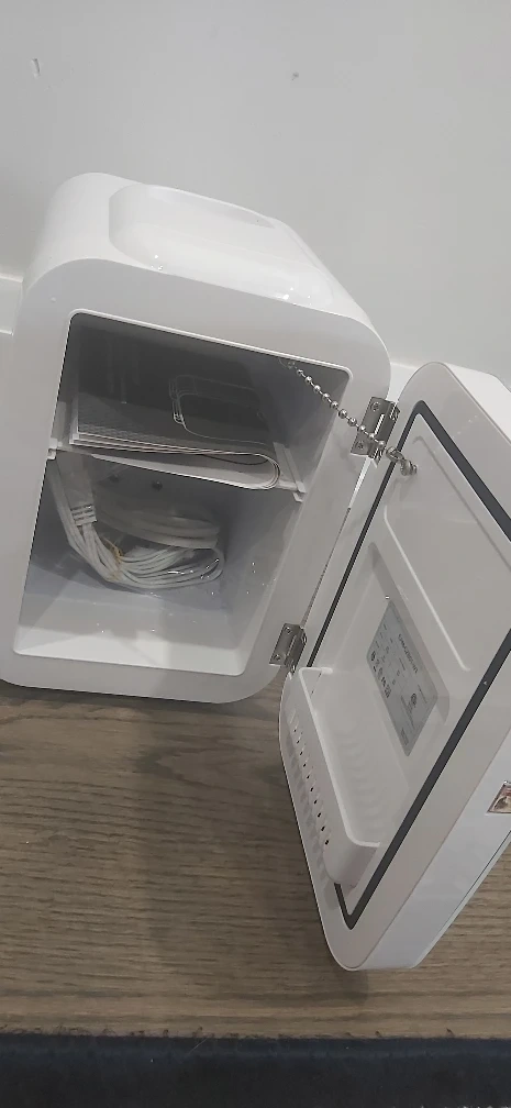 10Selling a mini fridge that's in great condition! It's white and has a 4L capacity. Perfect for keeping your skincare products cool. The original box is included, along with the charger and instructions