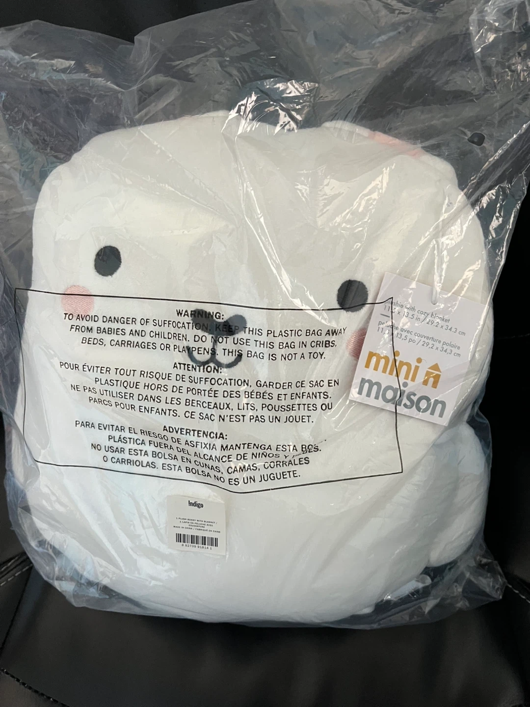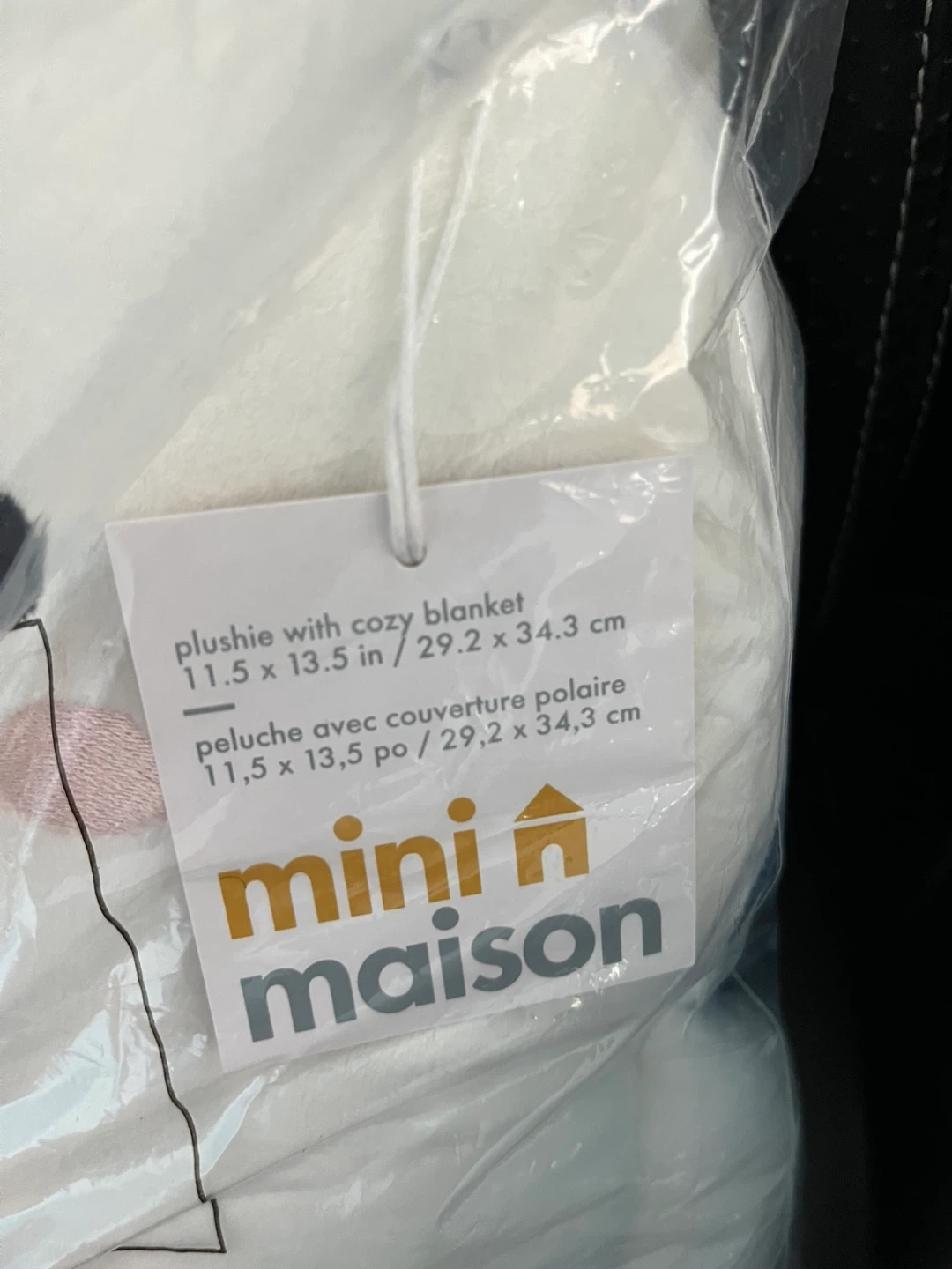 Selling a brand new Mini Maison plushie with a cozy blanket! The dimensions are 11.5 x 13.5 inches / 29.2 x 34.3 cm. It's still in its original packaging