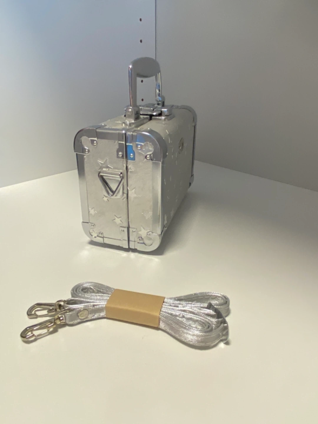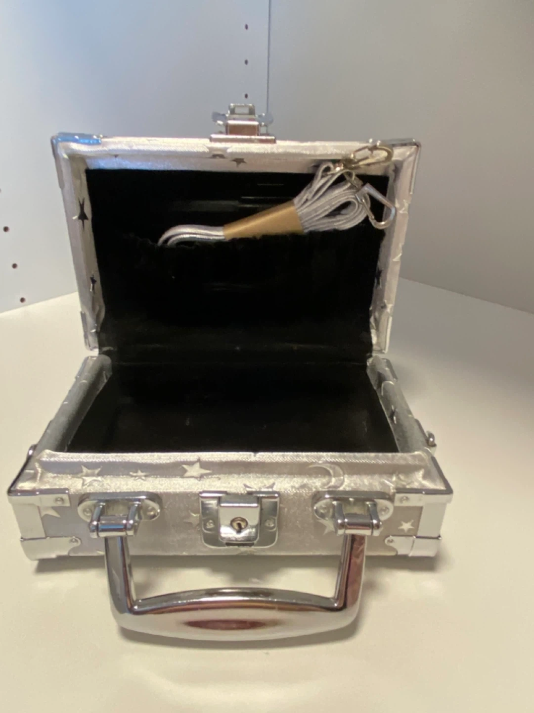 This is a super cute mini trunk box in silver with a star design! It comes with a detachable shoulder strap.
