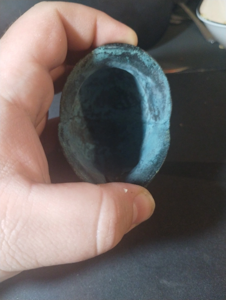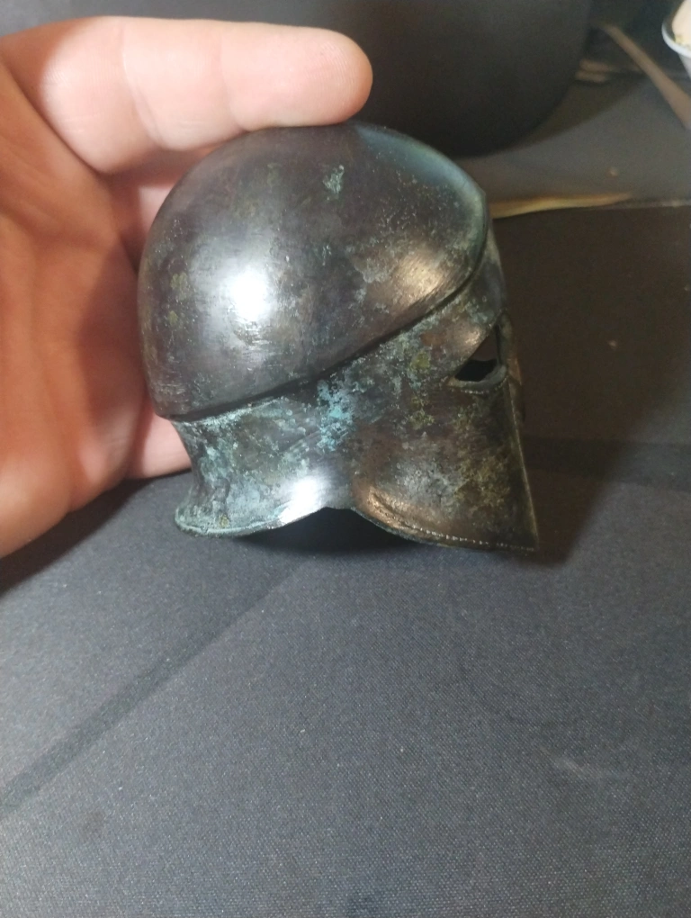 Selling a miniature bronze Corinthian helmet. It shows signs of wear and age, giving it a unique, antique look. It would be great as a decorative piece.