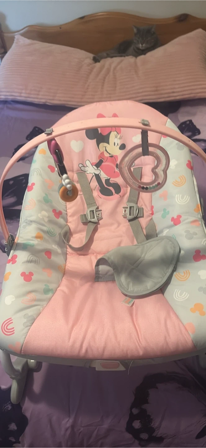 10Selling a baby bouncer with a cute Minnie Mouse design! It's pink and grey with colourful rainbow and Mickey Mouse details. Great for keeping your little one entertained and comfortable