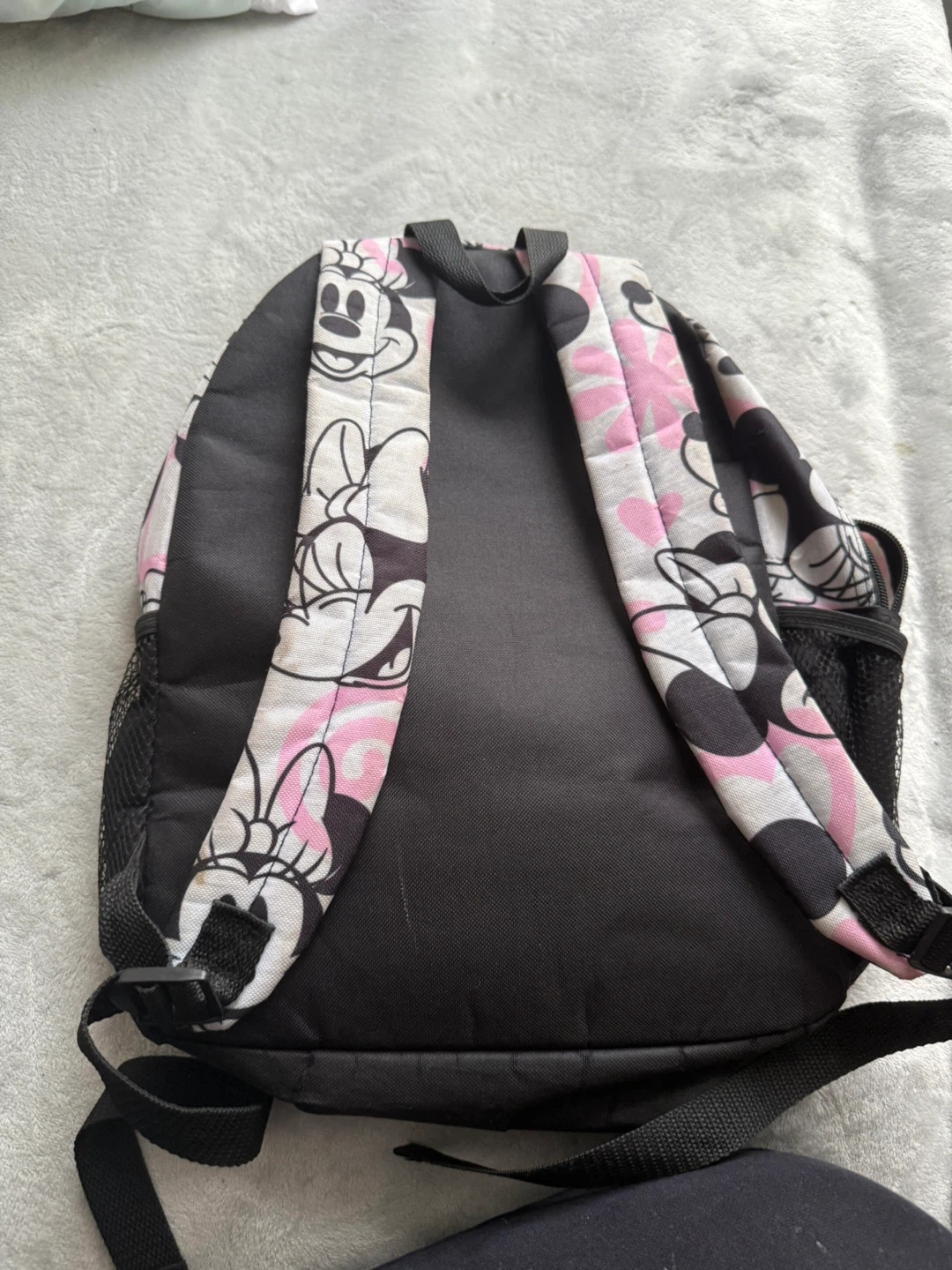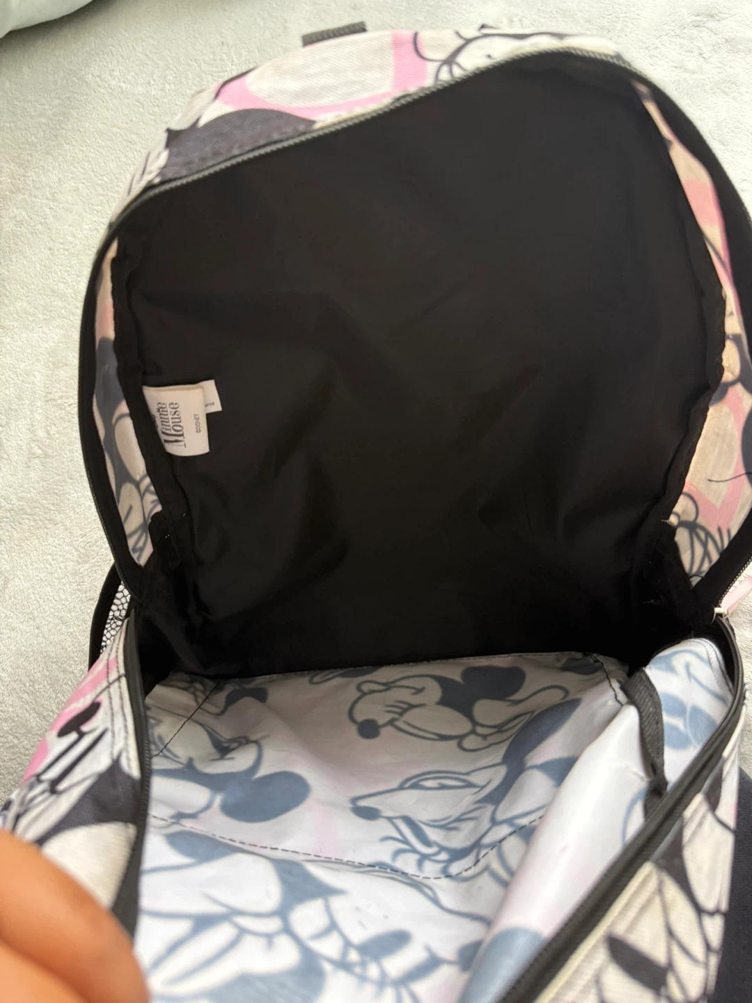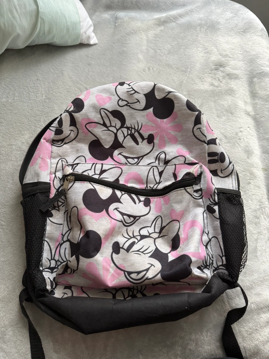 This is a cute Minnie Mouse backpack! It features a fun pattern with Minnie Mouse faces and pink hearts. The inside lining has a similar pattern. It's perfect for a little one!