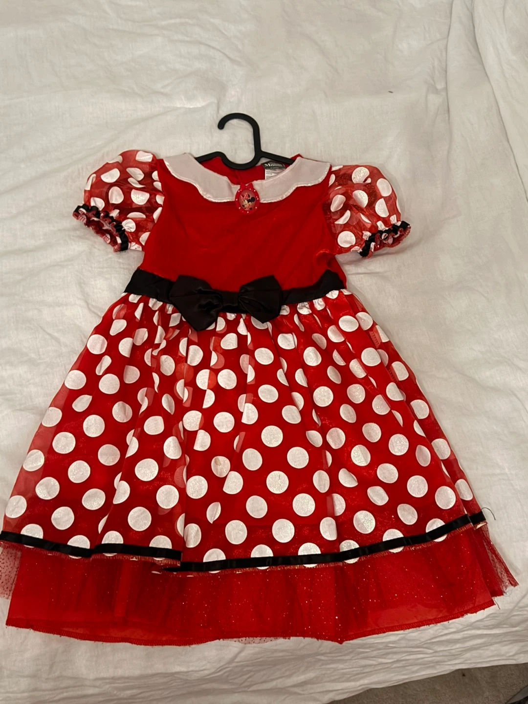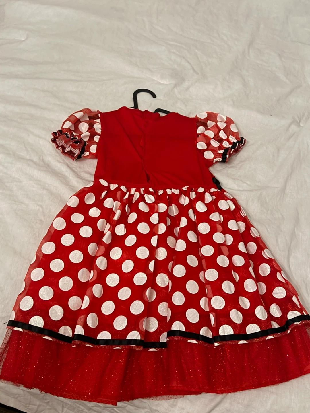 A cute Minnie Mouse dress for your little one! It's red with white polka dots and has a black bow. Perfect for dress-up or a special occasion/ Halloween (fits for 4-5 years old)
